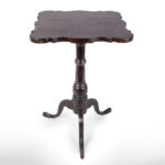 Beautifully shaped top on turned standard having chip carved lower terminus and sheet iron spider; ridged cabriole legs continuing to slipper feet featuring pinched sides.