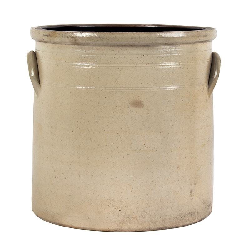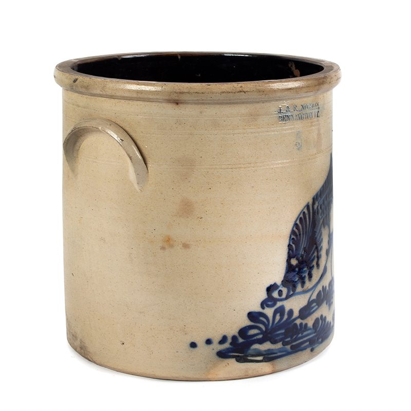 Cylindrical crock with semi-rounded tooled shoulder and applied lug handles decorated with a slip-trailed composition featuring a chicken pecking kernels of corn from a stylized ground featuring shrubs and grasses. Impressed maker’s and capacity marks brushed in cobalt.