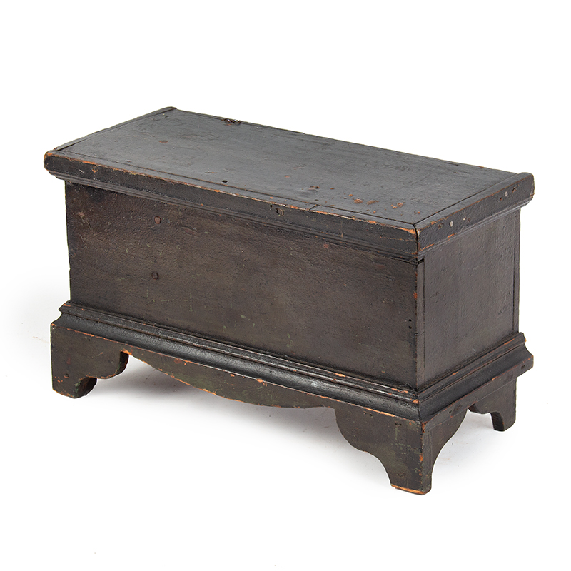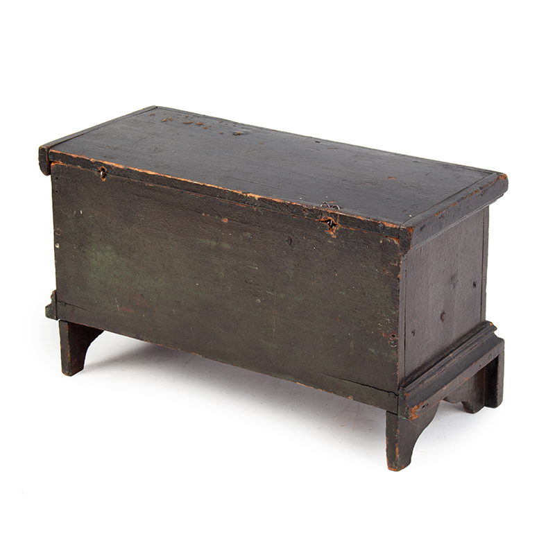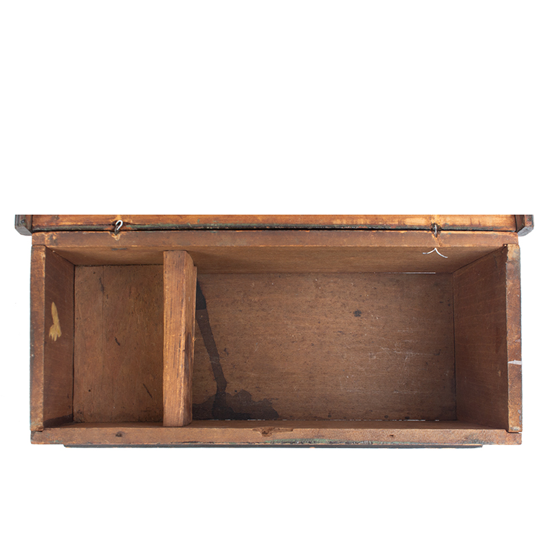Item Condition: : Very good considering age and use. The oxidized shellac/varnish over green/blue paint has oxidized, therefore the dark color. A shrinkage crack at one hinge piercing and to an applied lid molding long ago received a few small nails ensuring the integrity was without compromise. The wire snipe hinges were partially compromised and subsequently repaired. The box displays well.