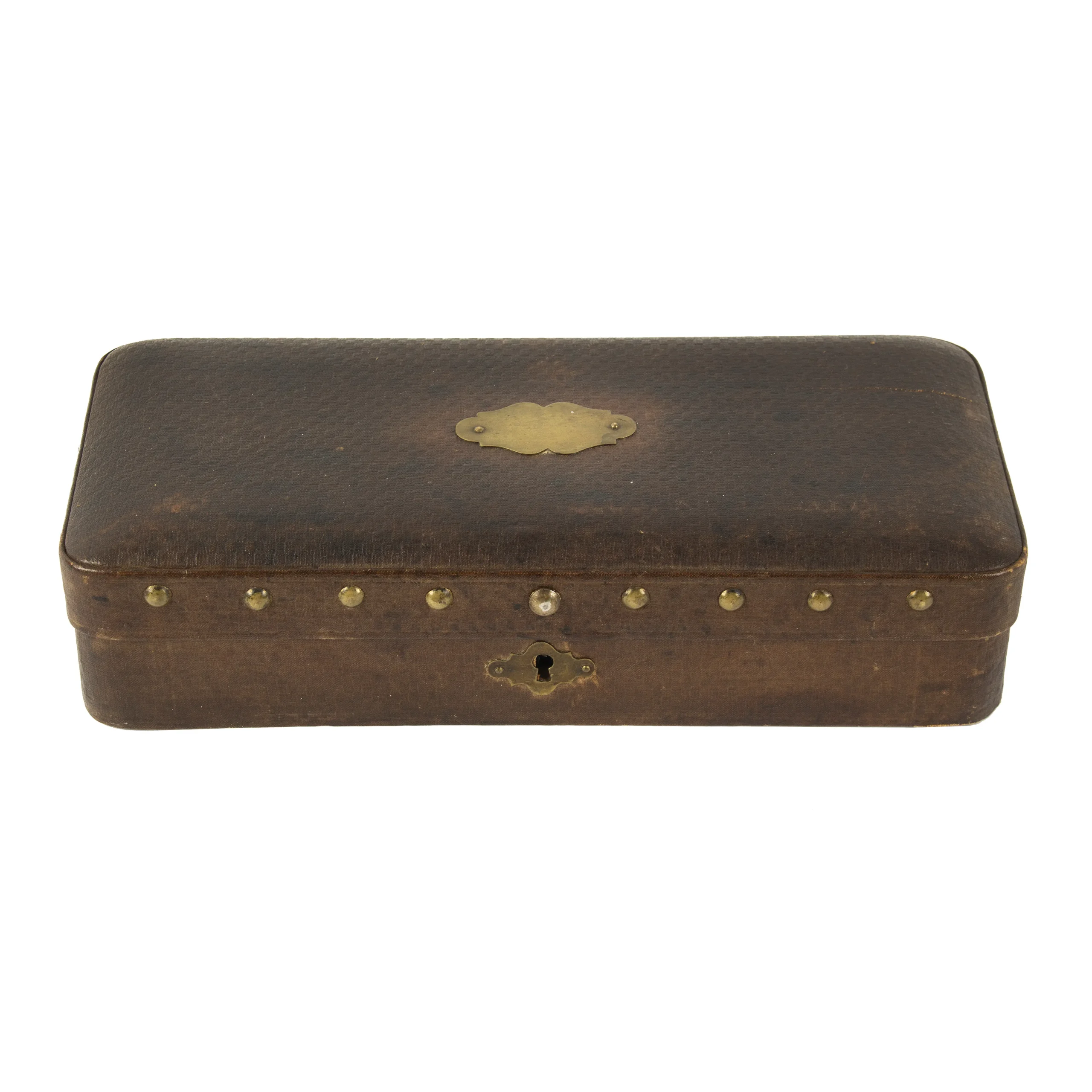 The pistol is contained in a basketweave pattern wrapped case, French fitted for the gun and 2 compartments to hold accessories, vacant.
