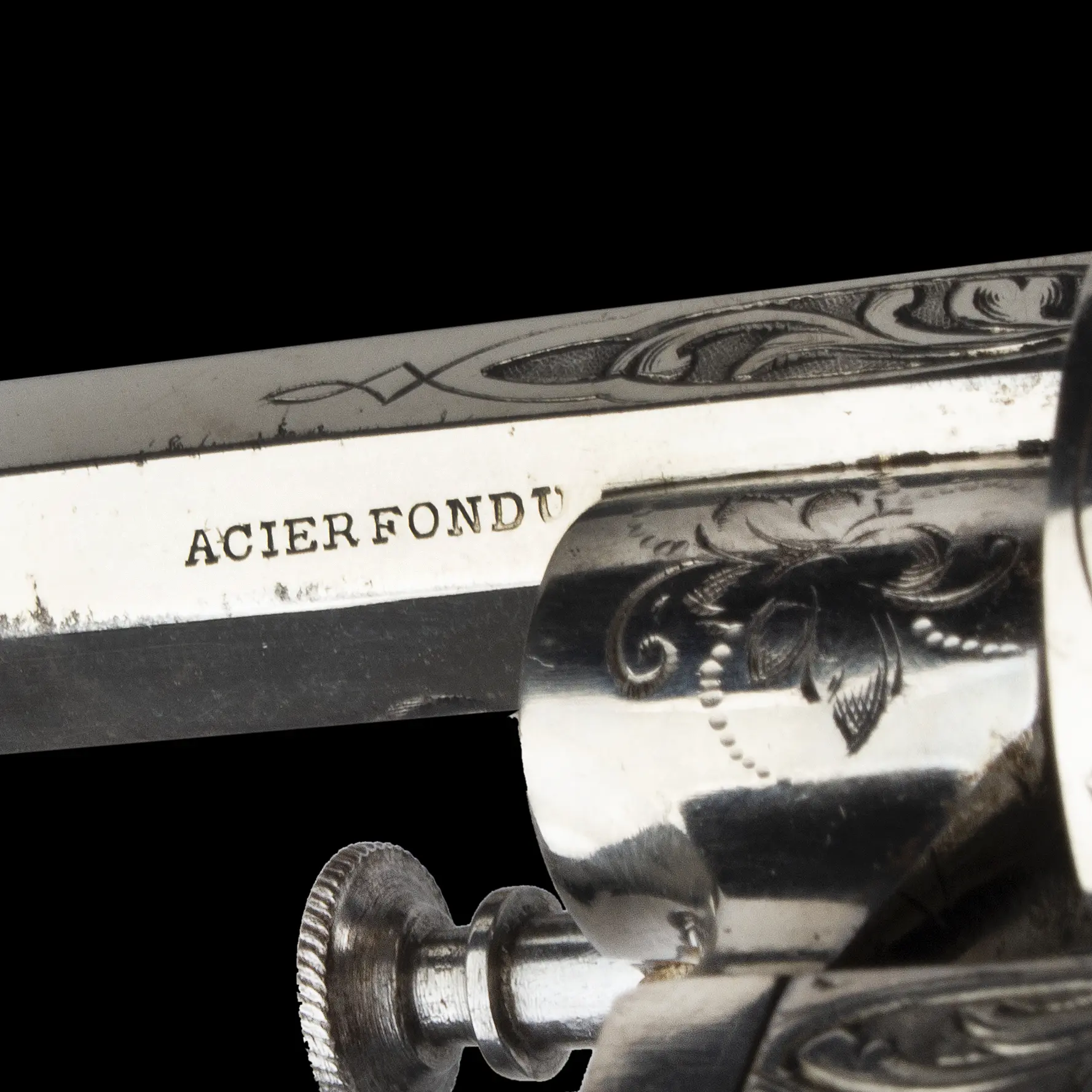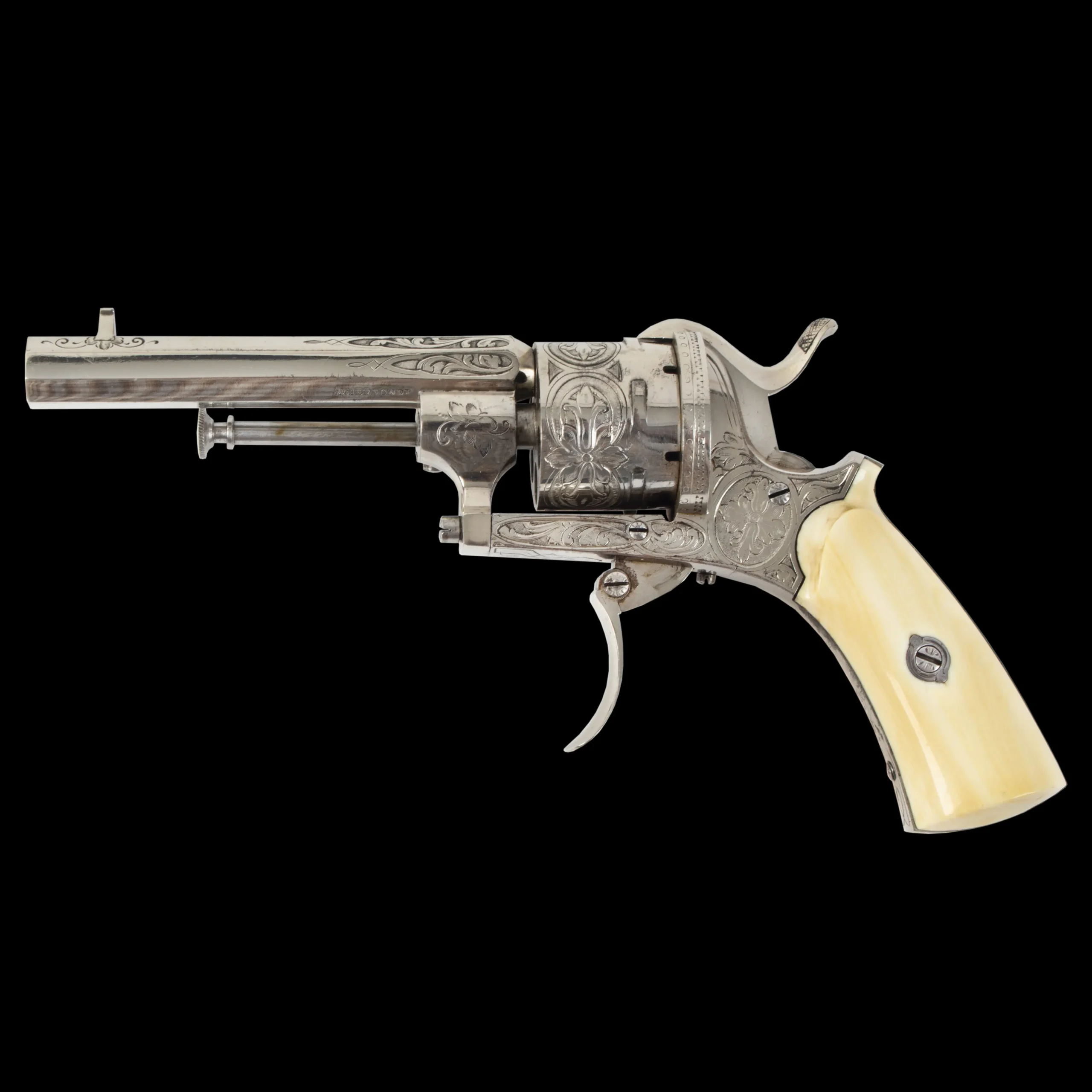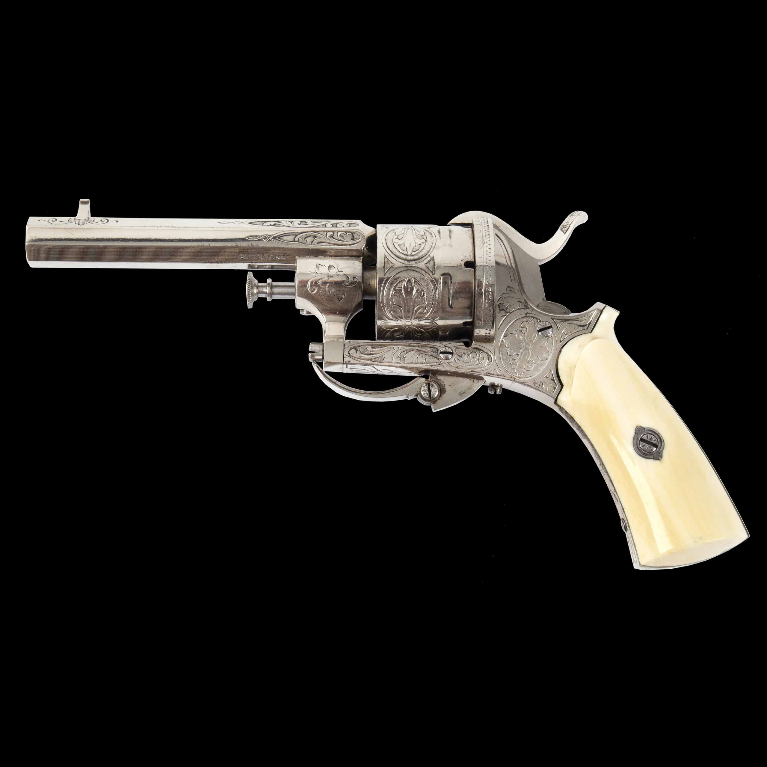 A very attractive nickel plated Belgian pinfire with signature folding trigger and high front sight, featuring fine floral engraving in approximate 50% coverage, comprising floral scroll and vignettes on frame, vignettes on cylinder, and scroll on approximately 1/3rd of barrel. Nicely grained ivory grips, retained by a single engraved screw through an engraved escutcheon. Belgian ELG proof visible on rear of cylinder and “ACIER FONDU” [cast steel] on lower left barrel flat.