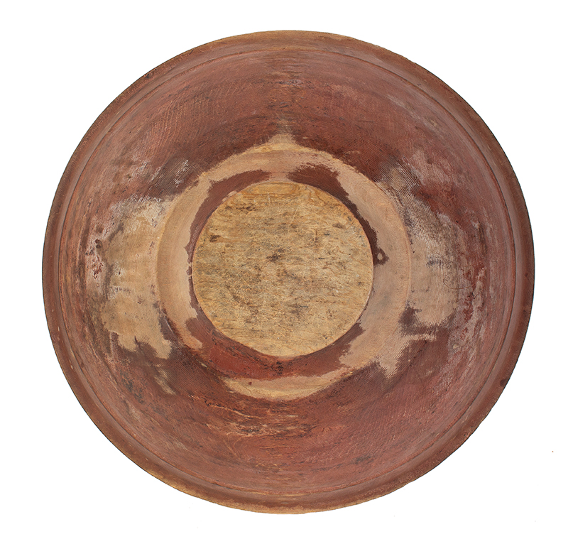 A terrific example featuring a pronounced projecting rim, visible tool marks [beehive], a foot… nice red paint; dry patina, and no cracks.