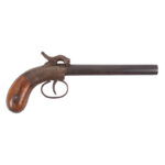 A pocket or boot pistol featuring side-by-side rifles barrels, each with its own hammer, each fired by the single trigger… one-at-a-time. This gun shows no markings, it is thought that unmarked specimens were made on order and were to be marked with trade names.