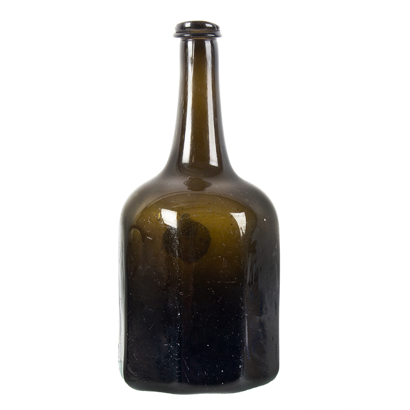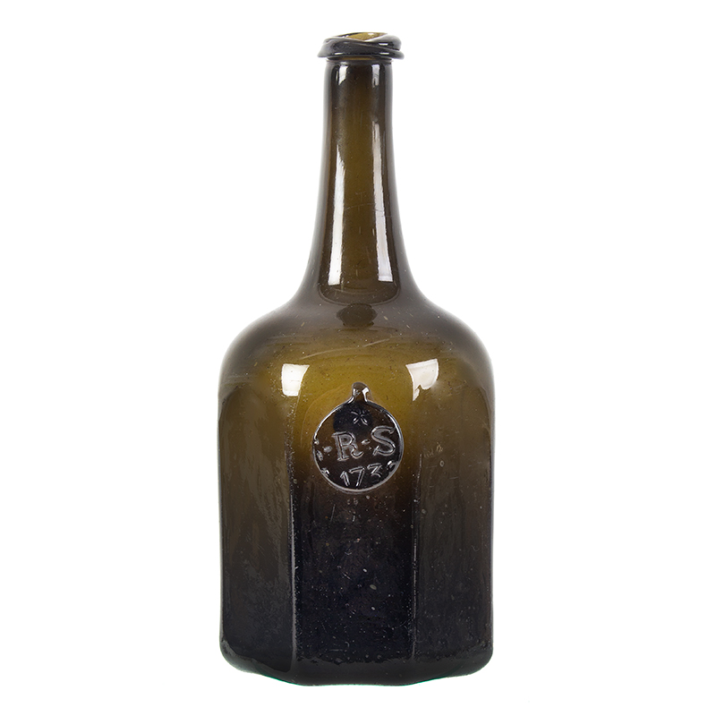 This is the rarest of sealed bottle forms, rarer than the paneled octagonal bottles though they are also quite rare. Details about the bottle are given below in the entry from David Burton’s three volume set of books about English Sealed Bottles 1640 to 1900 and the Families That Owned Them (pages 670 and 671). He states that the octagonal bottles of both forms have been found in the United States and he postulates that they may have been made in or for Americans. It is interesting that there are at least 5 known examples of these RS 1739 bottles, three in US private collections while Winterthur Museum and Williamsburg each have an example in their collection.