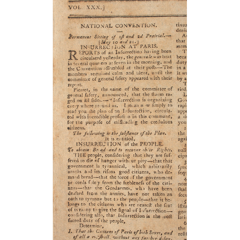 Writer’s note. As a researcher and collector of early American MSS and printed material, I generally dismiss non-war or non-important historical American dated newspapers, but I could not put this one down once I started reading. The entire front page is about the May 20,21 events in the French Revolution. Being that America has just completed an insurrection, and France attempting to copy the process, Americans took a keen interest in the events as they happened. 1795 was near the end of the French Revolt and focused on the formation of their new government. Anyone with an interest in France, Democracy, the Human Condition, would find this 4 page volume most interesting. Later in the volume there is the typical news copied from other national gazettes, and the 4th page has a 1/2+ column on the Connecticut Manufactory Lottery with “Now or Never” banner heading. Following the lottery write up in an advertisement for Western Expansion with a man gathering his travelers and offering 200 acres to be conveyed when they arrive (uh huh). Fascinating reading for an inquiring mind, history buff.