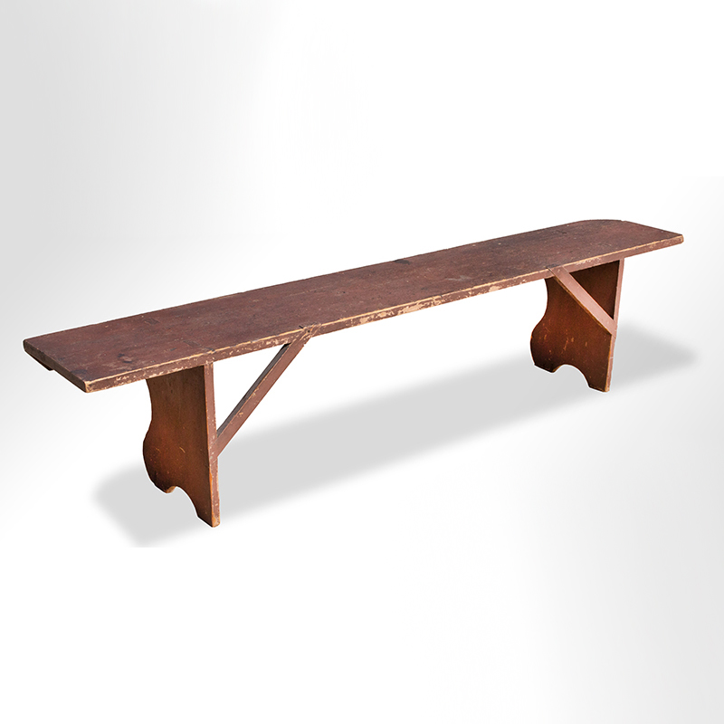 The top raised on shaped front legs resting on demilune cutout feet; legs joined by beaded apron; back of legs and bench canted brackets set into dadoes. It appears that this bench was made to fit a specific space, likely against a wall… perhaps a bucket bench; originally fabricated with one end of top being squared, the other with ovolo front corner.