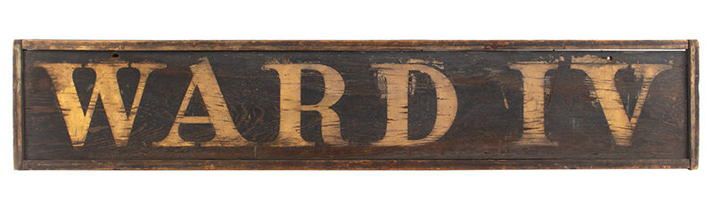 The image shows an antique wooden sign with the text “WARD IV” in large, gold-colored letters on a dark, weathered background. The sign’s aged appearance, including the worn edges and faded paint, suggests it could date back to the late 19th century or the very early 20th century, though an exact date is difficult to determine. The Roman numeral “IV” (4) likely indicates a ward, which could refer to a district or section of a city, town, or institution, such as a hospital or electoral division.