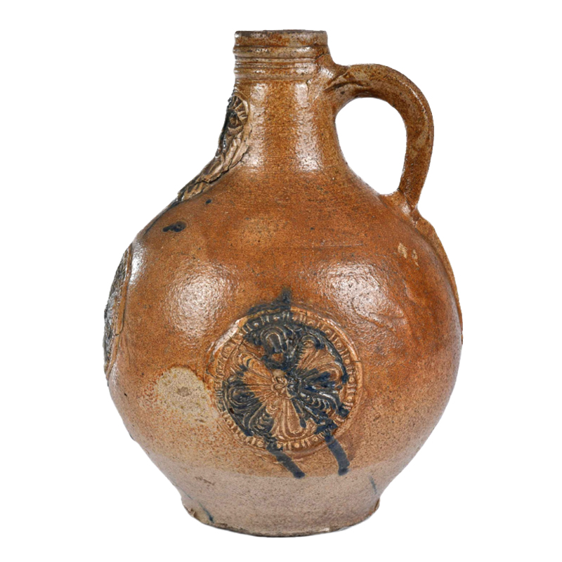 Large Bellarmine jug with cordoned rim, and splashes of cobalt on face and medallions that add interest.