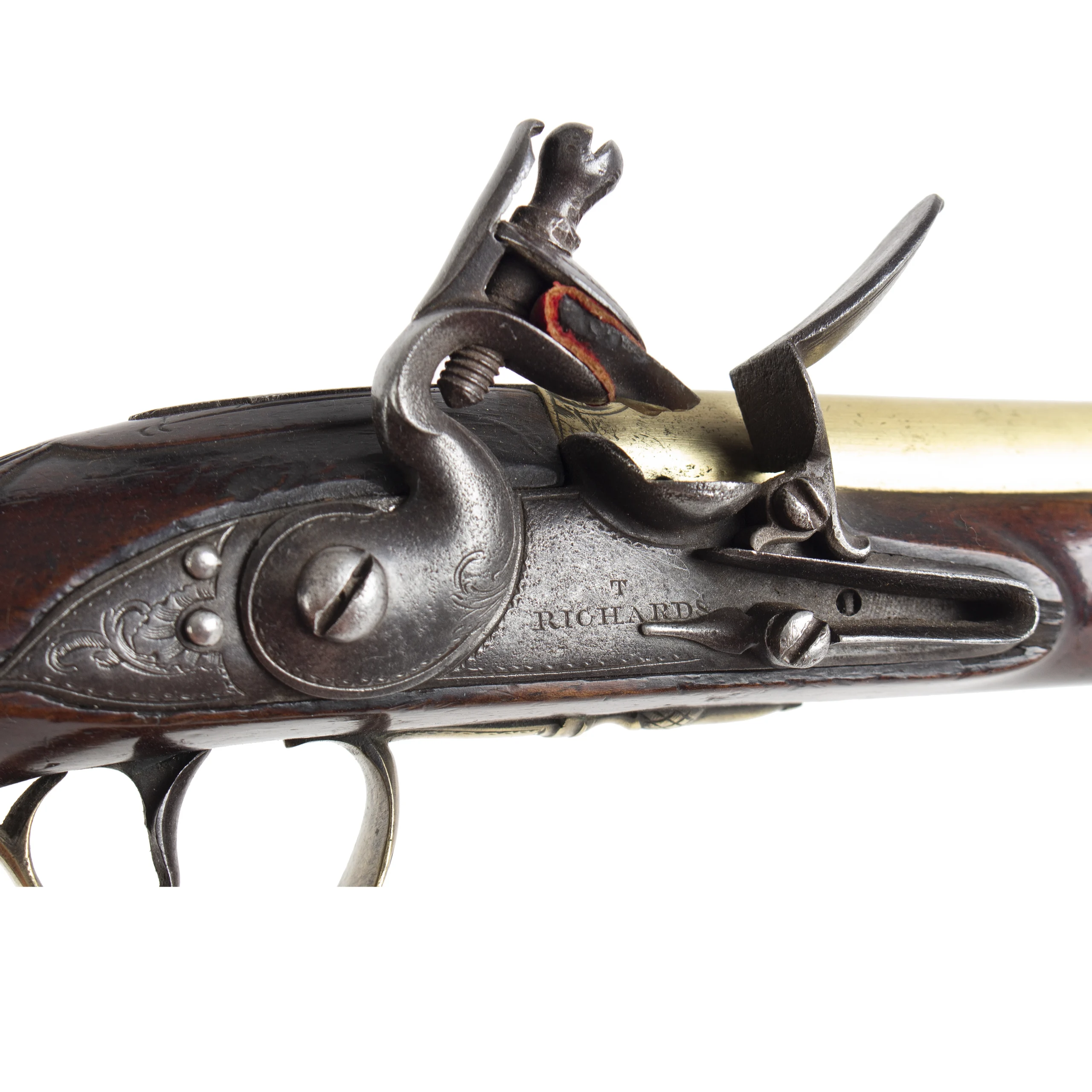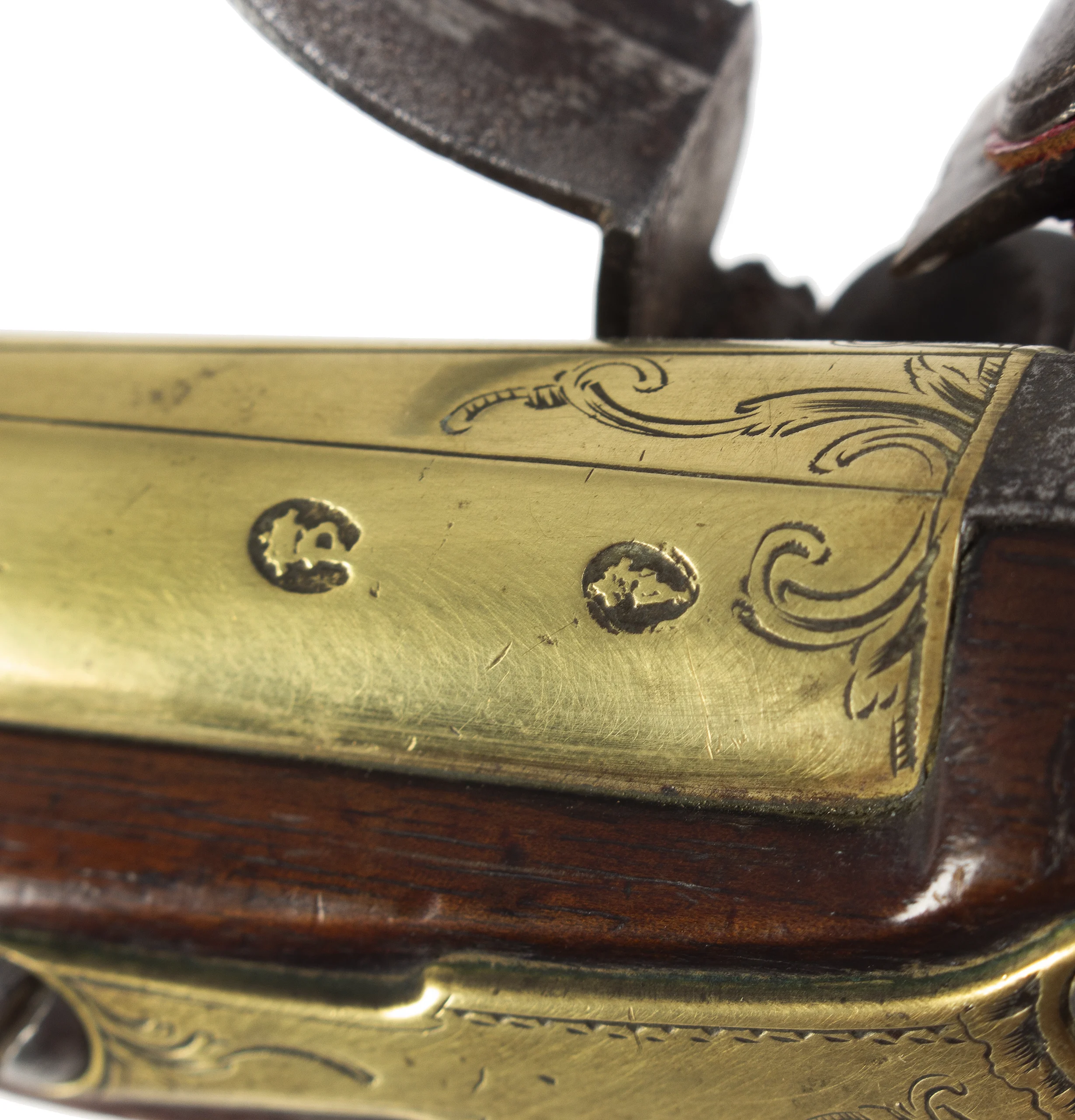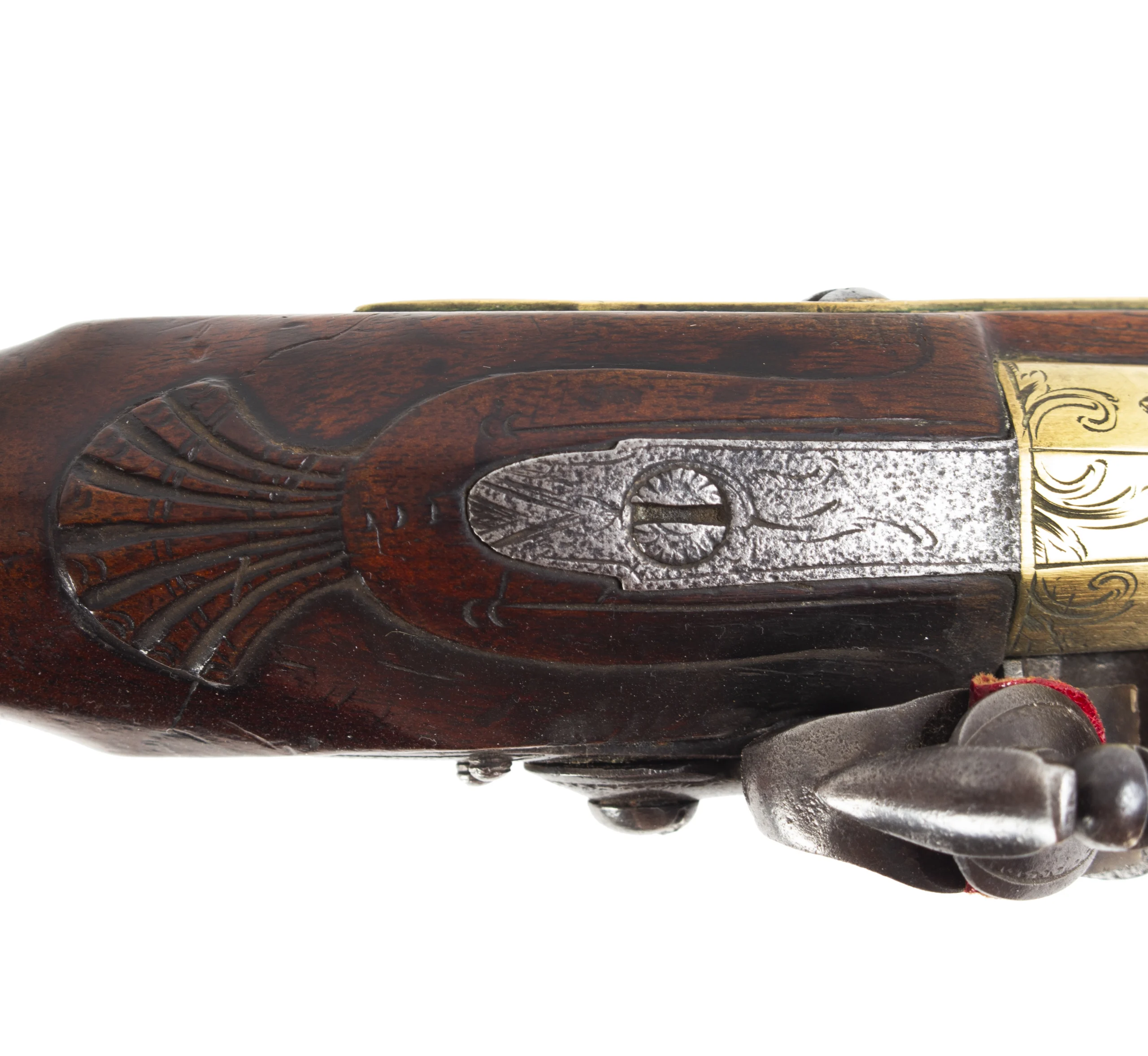 A classic late-18th-century original flintlock pistol attributed to Birmingham gunmaker Thomas Richards (active c. 1747–1779/84). The barrel features decorative engraving near the breech (including scrolls and a teardrop motif), along with two small proof marks: crown over “P” (definitive proof) and crown over “V” (view), consistent with Birmingham private proofs of the pre-1813 period (often imitating London standards). The walnut stock is fitted with brass furniture, including a fan/shell carving centering the breech tang, a vacant thumb-piece escutcheon on the wrist, and a butt-cap featuring a mask (grotesque face). The brass trigger guard with long tang is engraved [border] and has a acorn forend; brass sideplate is engraved. The convex lockplate is signed “T. Richards” and retains its original flintlock mechanism. The pistol exhibits typical age-related patina commensurate with age and use…a solid example of provincial English gun making from the Georgian era that displays well.
