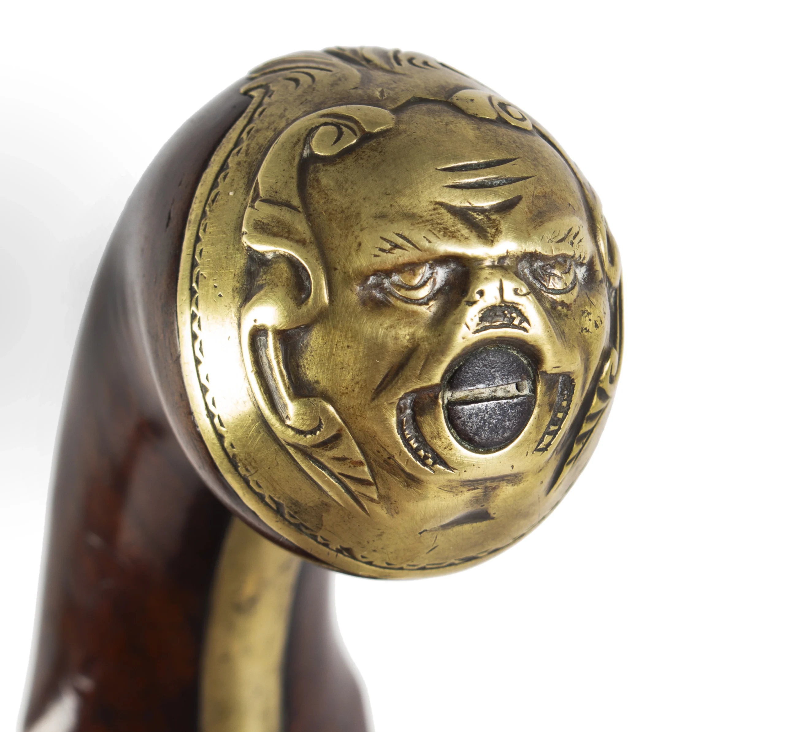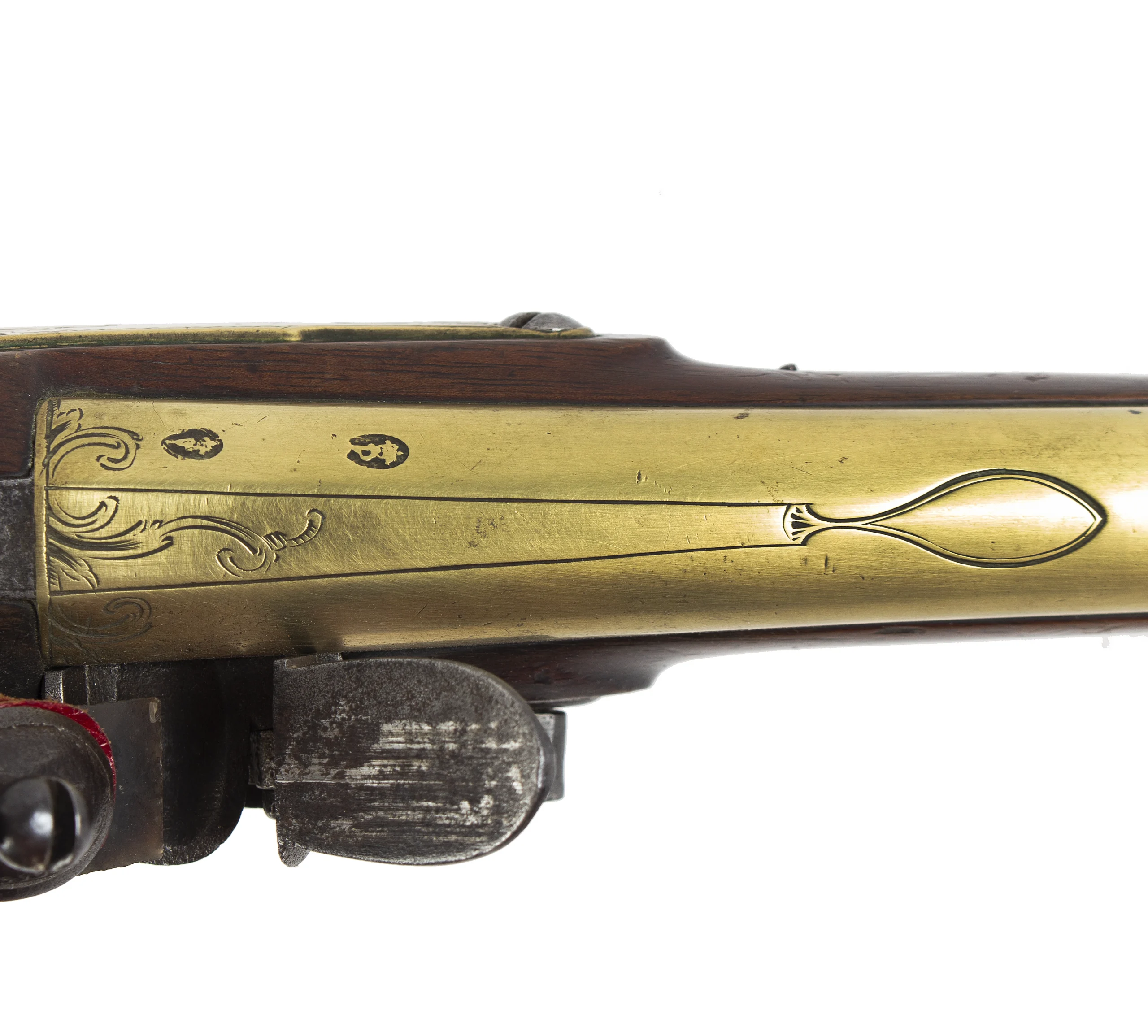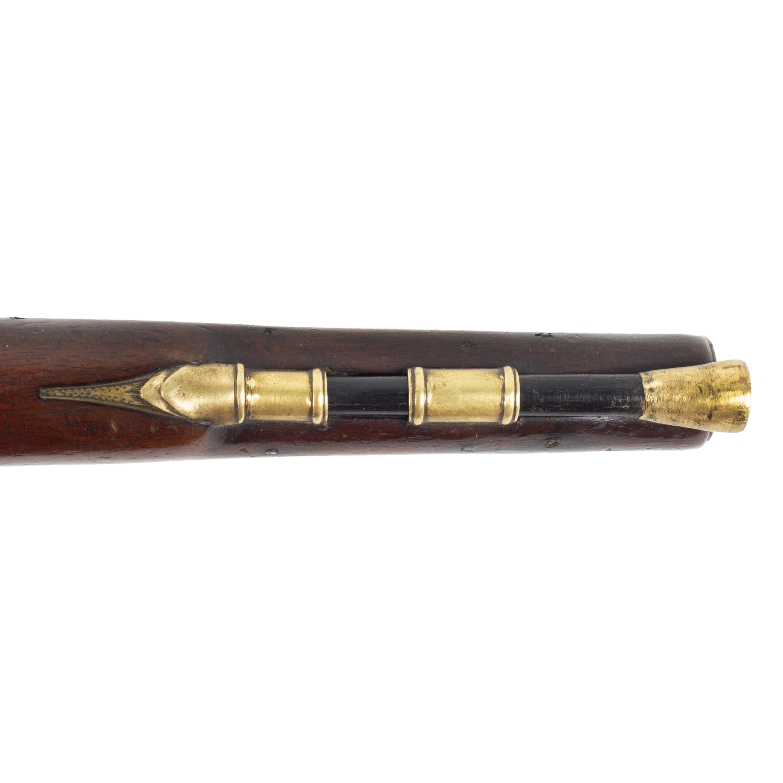 A classic late-18th-century original flintlock pistol attributed to Birmingham gunmaker Thomas Richards (active c. 1747–1779/84). The barrel features decorative engraving near the breech (including scrolls and a teardrop motif), along with two small proof marks: crown over “P” (definitive proof) and crown over “V” (view), consistent with Birmingham private proofs of the pre-1813 period (often imitating London standards). The walnut stock is fitted with brass furniture, including a fan/shell carving centering the breech tang, a vacant thumb-piece escutcheon on the wrist, and a butt-cap featuring a mask (grotesque face). The brass trigger guard with long tang is engraved [border] and has a acorn forend; brass sideplate is engraved. The convex lockplate is signed “T. Richards” and retains its original flintlock mechanism. The pistol exhibits typical age-related patina commensurate with age and use…a solid example of provincial English gun making from the Georgian era that displays well.
