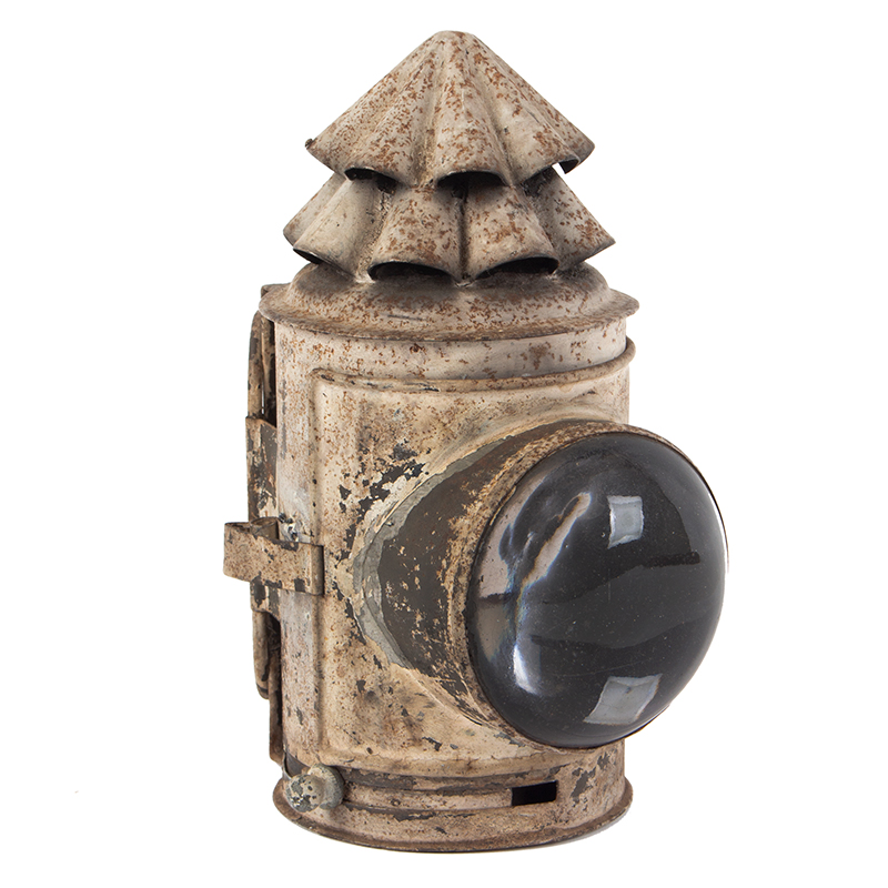 A mid-19th century lantern commonly used by police and fire companies. The lamp is constructed of tinned sheet iron with a fluted ventilator, clear magnifying bull’s-eye lens, and a knob below the lens which can be pulled from left to right, rotating an interior cylinder, thus blocking the light. Retains its original dead-flame “rope-type” whale oil burner with two vertical wick tubes.