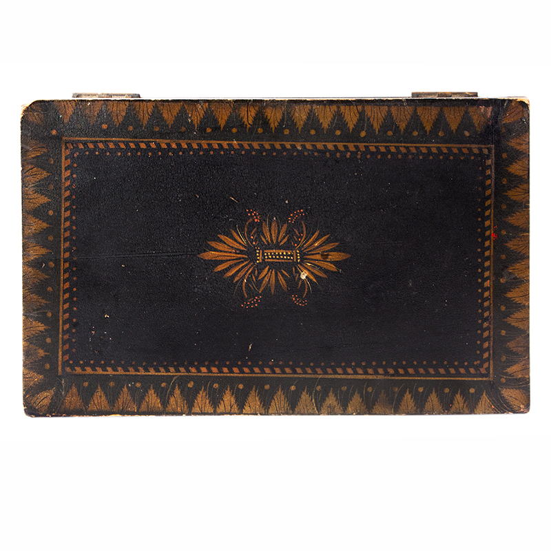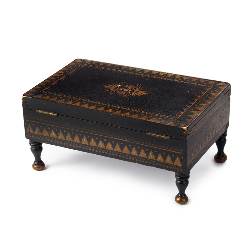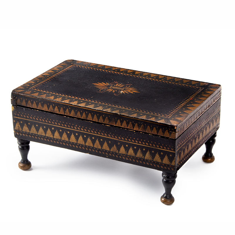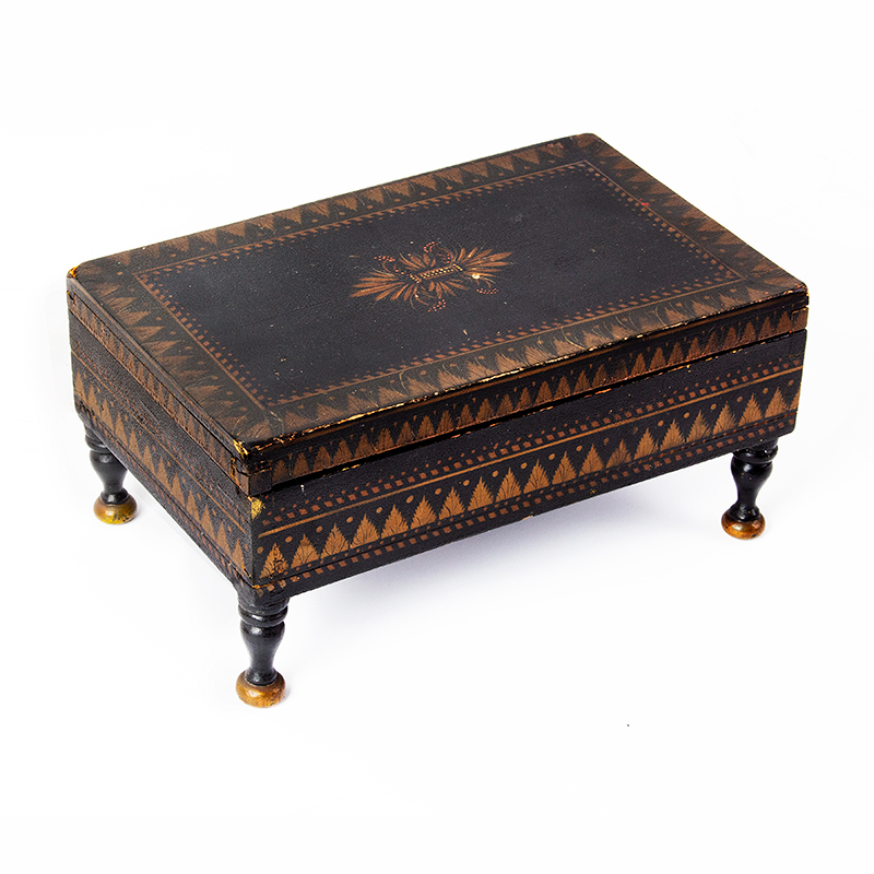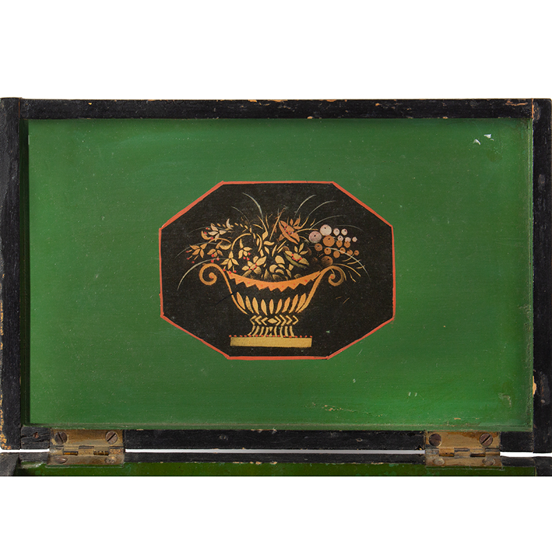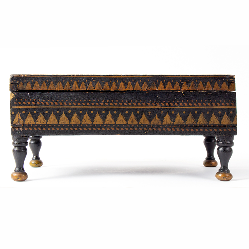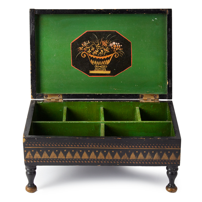 Rectangular lid over a fitted interior containing 6-compartments; box is dovetail joined and raised on turned legs resting on compressed ball feet. The center of lid is ornamented with a leafy floral composition centered by a stenciled foliate outside border…the front, sides, and back of case are similarly decorated. This lovely example was once owned by Pam Boynton.