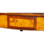 The top with serpentine front, canted ovolo corners and half- serpentine ends on a conforming skirt joining turned, and reeded legs.
