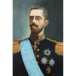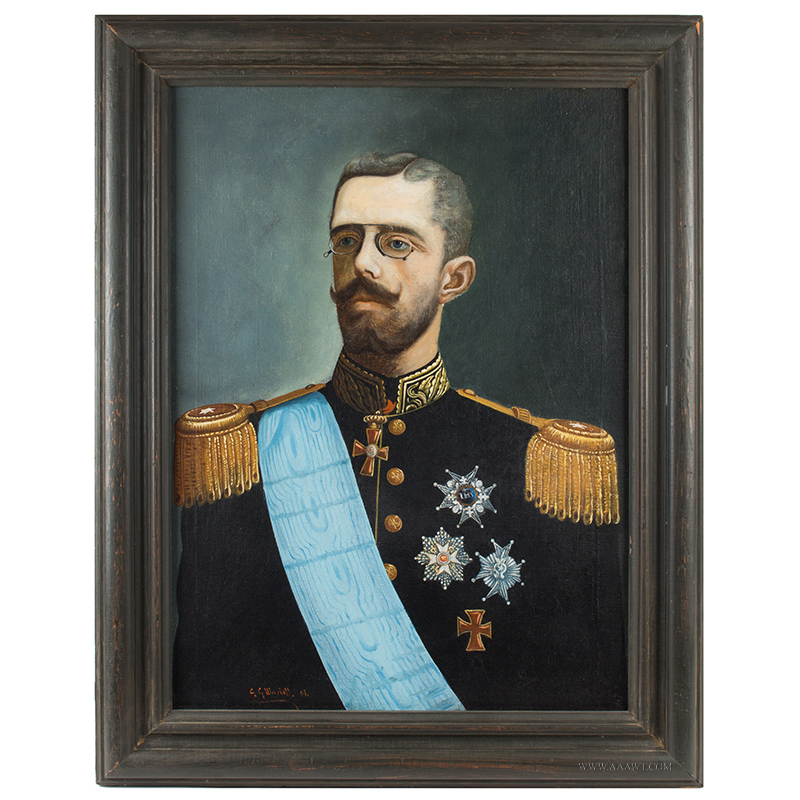 Painted about a year after his accession to the Swedish throne, Wadell shows Gustav in his army General’s uniform. Probably painted after an existing photograph, medals have been added and removed. Though images of the new king were available to the mass market following the advent of early photography, painted portraits were desirable because of their vibrant colors.