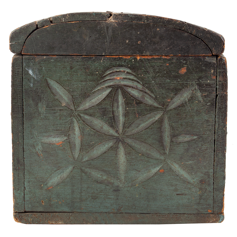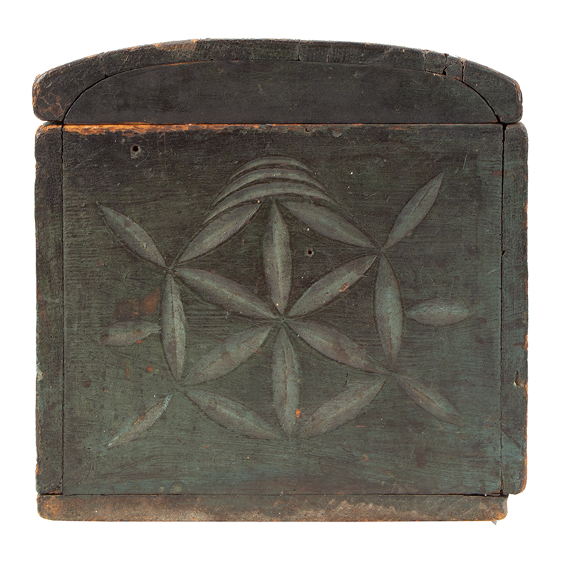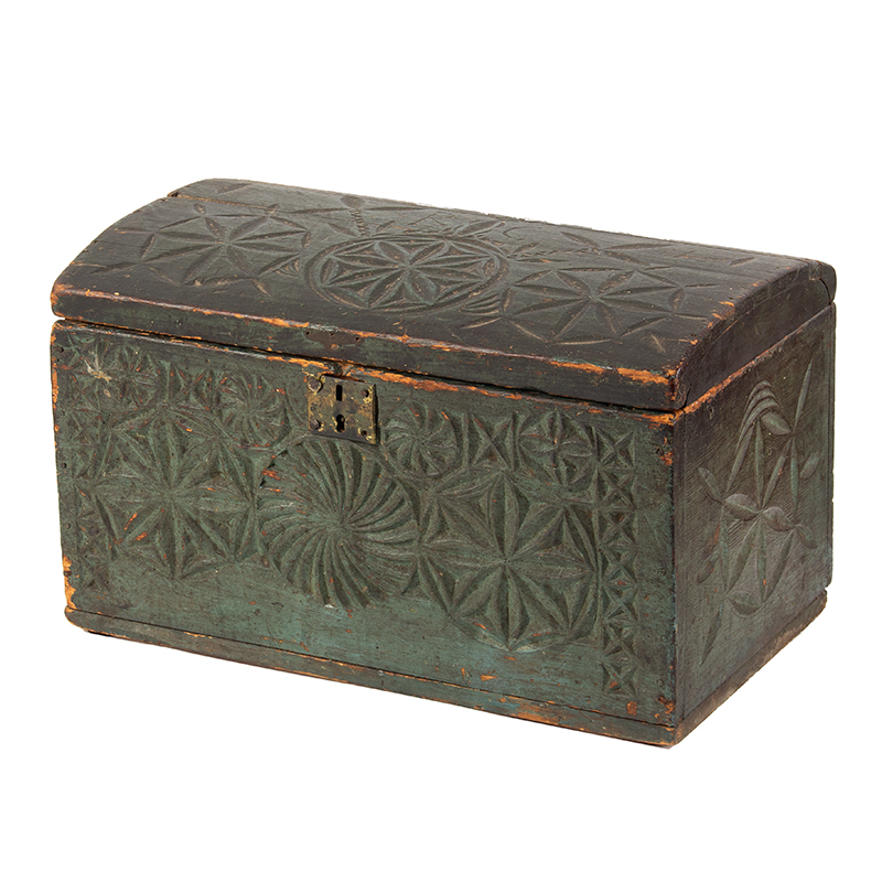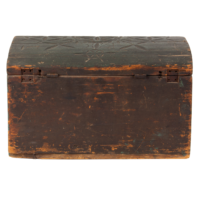 Classic mid-18th century New England dome-top made of pine for lightweight storage of documents, valuables, or small household items. The domed lid is well-executed with a gentle curve; joinery includes treenails and tiny handwrought T-head finish nails. The soft blue/green (almost verdigris-like) paint over what appears to be an earlier or original ground layer contributes to a wonderful, layered “soulful” surface history – including wear at edges, crackling, and oxidation that can’t be imitated.