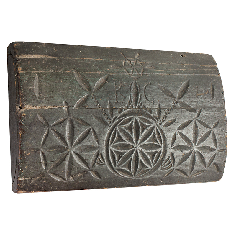 The repeating floral/star motifs echo simpler versions of motifs seen in coastal Massachusetts pieces, distinct from the more elaborate Dutch-Frisian chip-carving which tends toward tighter geometric diamonds or lozenges in denser patterns.