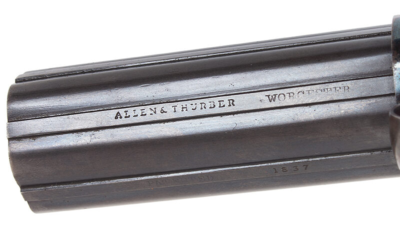 The 6-shot barrel assembly displays the following markings, each on a solid rib: “ALLEN & THURBER WORCESTER”, PATENTED 1837″, “CAST STEEL”, and “BOLEN 04 B’WAY, N.Y.” for the New York City retailer J.G. Bolen. The retailer marking was hand stamped by Bolen and is mostly missing the “1” in the street address because the die was broken; the address line should read “104.” The frame and nipple shield are engraved with floral scroll patterns. The left side of the bar hammer is marked “ALLENS PATENT.” A silver oval inlay is featured on each grip panel. Matching batch number “34” appears on the grip frame, hammer, hammer spring, trigger guard, both grip panels and barrel cluster. The period partitioned case contains a leather wrapped cylindrical powder flask, lead balls, a two-cavity iron bullet mold, case key, and cleaning rod.