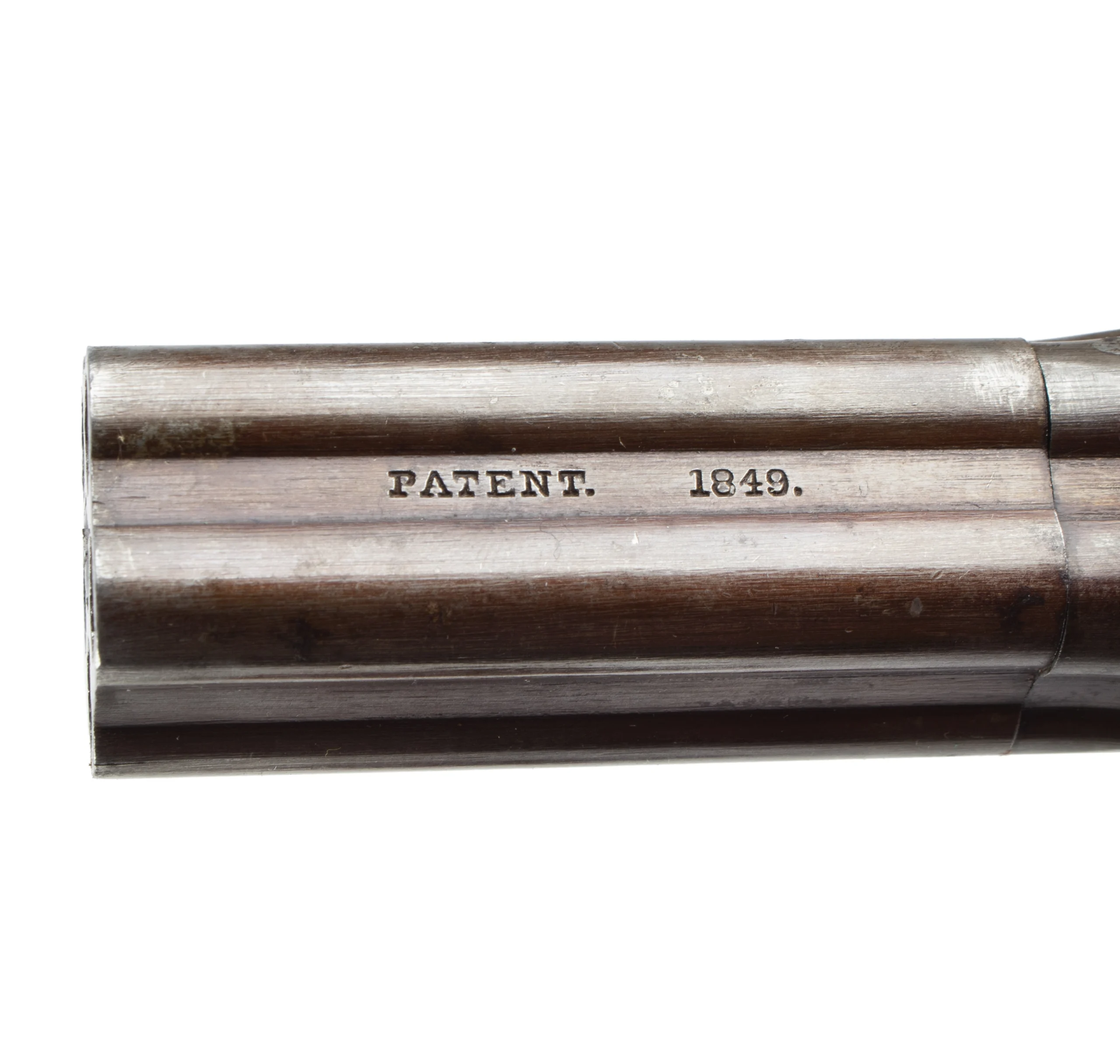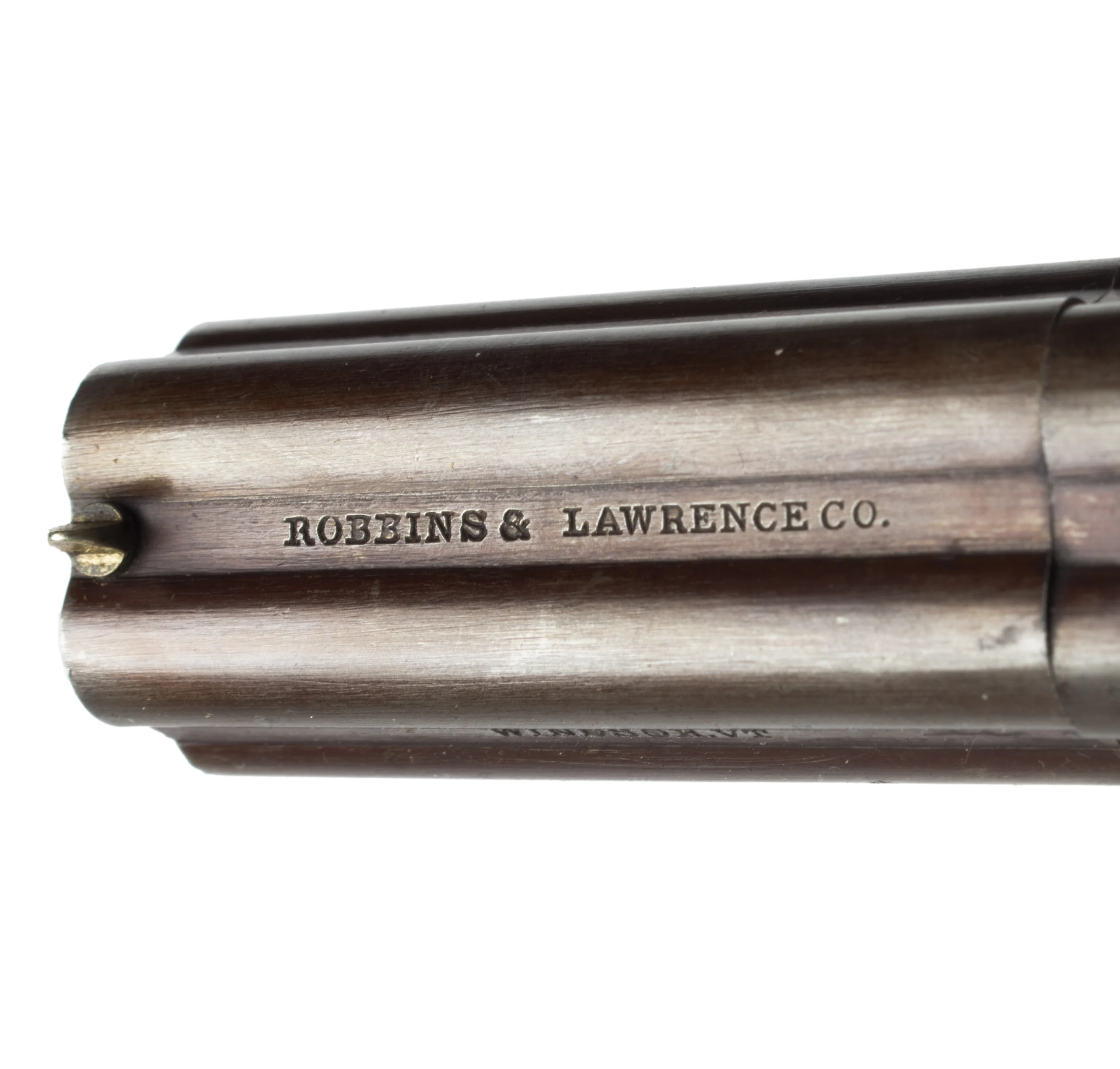 A fine .28-caliber small frame pepperbox, serial number 2472, 5 shot barrel group, beautifully cased with all its accessories. Robbins & Lawrence pistols featured a distinct shape…a unique swoosh at the back of the frame. The barrel cluster retains a beautiful smooth brown finish; attractive engravings and retains about 90% original deep blue. Ribbed barrel cluster, hinged model…tips down for capping; barrel screws off at breach for loading The case contains a marked Robbins & Lawrence flask (never seen with any other pistol), bullet mold and distinctive Robbins & Lawrence tool for removing the barrel; case key is included.
