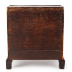 The slant lid opens to rest on lopers; interior features four cubbies. The case containing three overhanging thumb-molded drawers is raised on applied bracket feet.