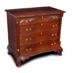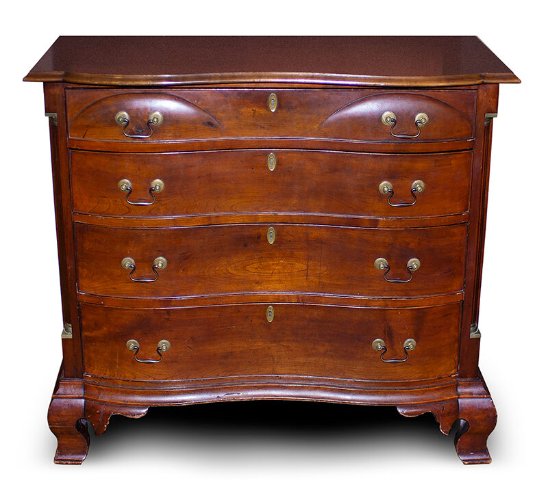 Overhanging molded rectangular top featuring serpentine front, and blocked ends over a conforming case having inset fluted quarter columns flanking cockbeaded graduated drawers. The case on molded base is raised on robust case-conforming ogee feet. The chest displays rich color. The swelled top-drawer design is related to Eliphalet Chapin shop traditions.