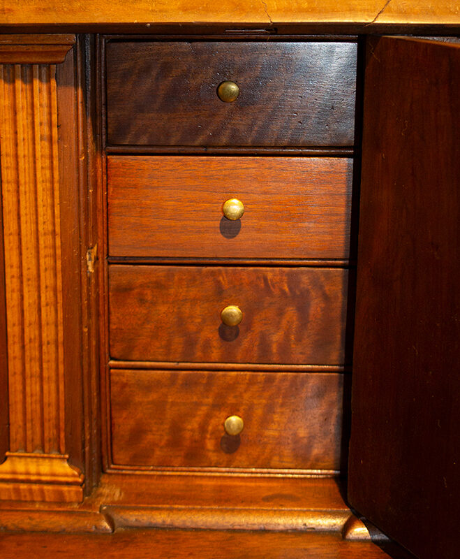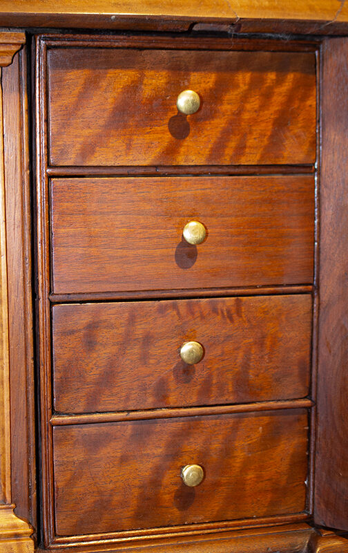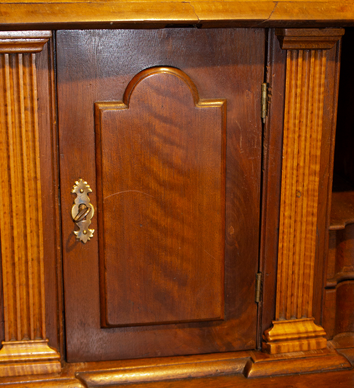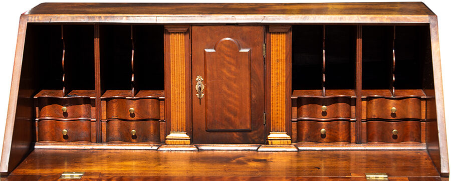 The desk displays nice proportions; fall-front opens to reveal a prospect section featuring raised tombstone paneled door behind which are four drawers concealing hidden drawers… flanked by document drawers. The interior contains cubbies with shaped dividers over a total of 8 serpentine drawers [four on each side]. Rather than the usual lopers the lid is supported by a pair of candle drawers. The case having molded base contains four graduated thumb-molded drawers and is raised on outstanding ogee feet.