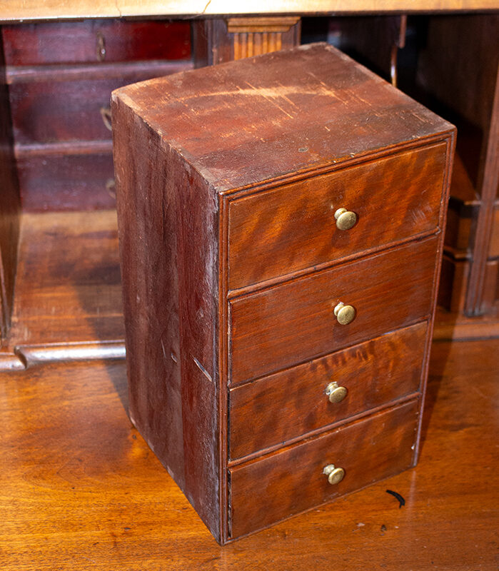 Item Condition: The desk displays well; any imperfections are trivial and commensurate with age and use. Lid hinges have been reset; brasses are not original; drawers have been drilled for several sets of hardware.