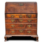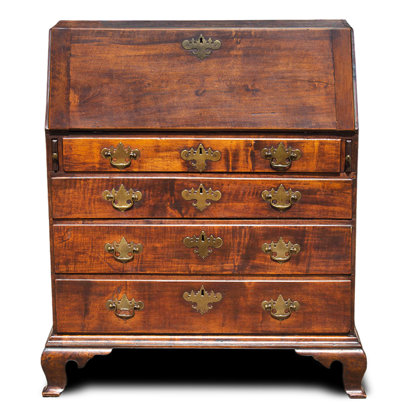 Original brass hardware, excellent condition The fall front slant lid opens to an interior featuring central shell-carved prospect door flanked by four valanced pigeonholes above two rows of drawers. The case containing four graduated thumbmolded drawers is raised on ogee feet.