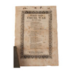 Broadside, Civil War. Confederate Song Sheet “When This Cruel War is Over”. (1862) Civil War Era Confederate Song Sheet titled “When This Cruel War is Over” by Charles C. Sawyer, Fine. This original Confederate Song Sheet measures 9″ x 6.5″ published by J. C. Schreiner & Son, Savannah, GA., sold by Horace Partridge, Boston. Text enclosed by an ornate border. Edge splits along all edges, paper loss at top, scattered spotting.