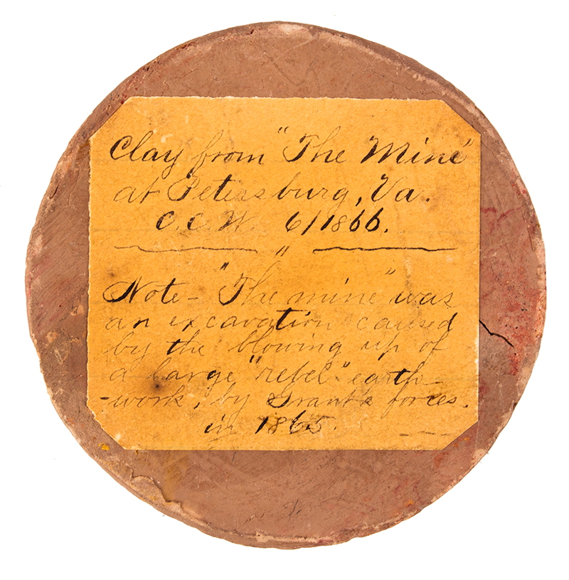 Embossed with a neoclassical star and a bust identified as Abraham Lincoln, possibly a commemorative mold or medallion. Labeled as clay from “The Mine at Petersburg, VA, C.C.W. 6/1866” (Civil War), referencing the Battle of the Crater (July 30, 1864), where Union forces detonated a mine under Confederate lines. Likely a postwar souvenir honoring Lincoln post-assassination (April 1865).