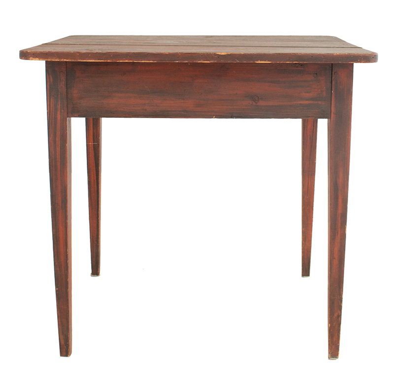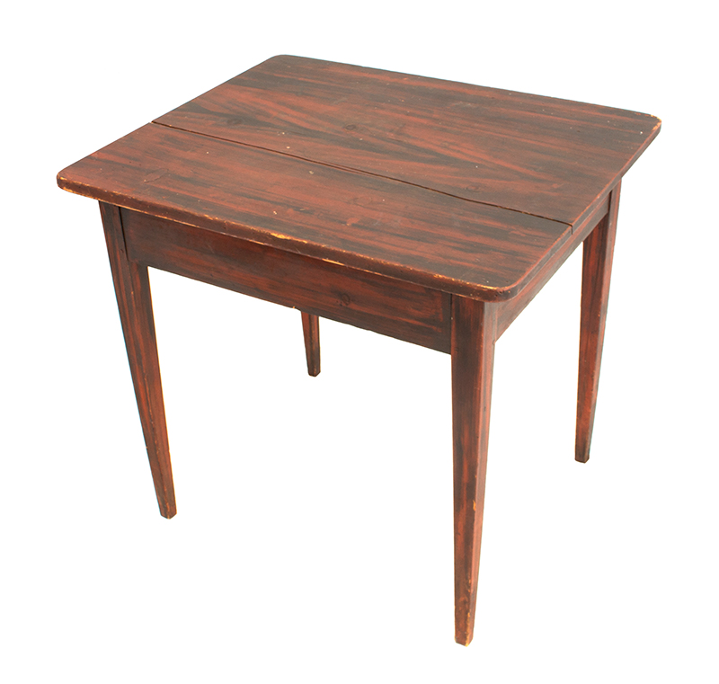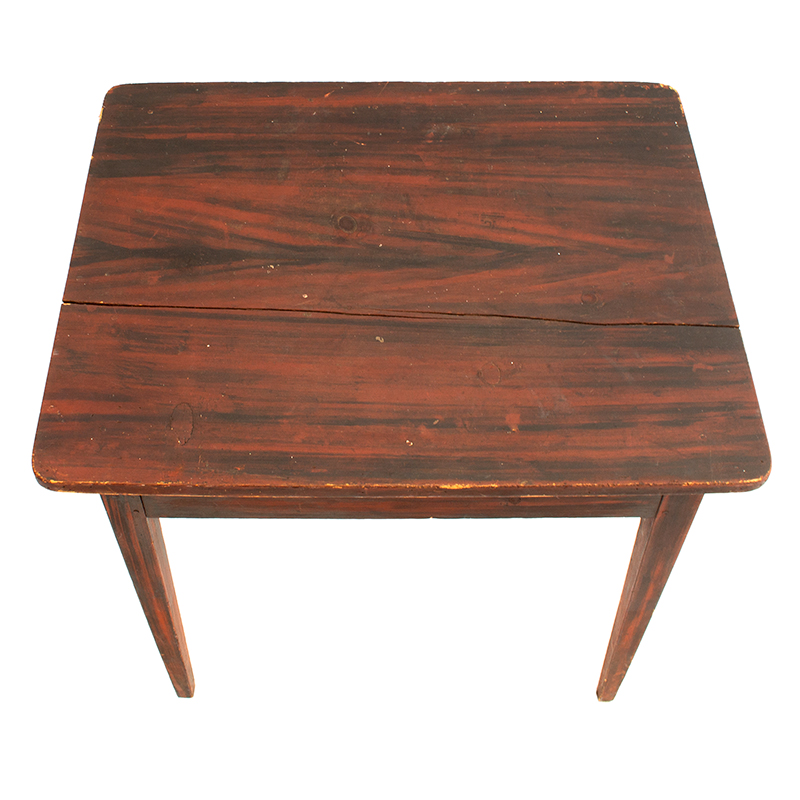 The top with ovolo corners on a plain apron joining double-tapered legs. Faux grained surface featuring broadly brushed black against red paint.