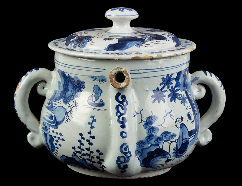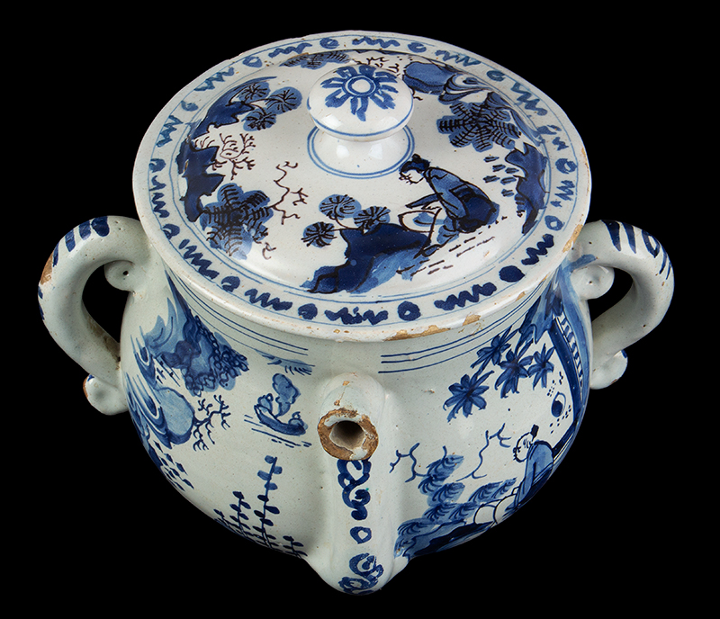 Bulbous form profusely decorated… Chinese figures in stylized garden landscape; scroll handles with dashes; at center of space between them spout sharply curved at level of pot’s neck displaying Chinese scrolls. Domed cover surmounted by a button finial