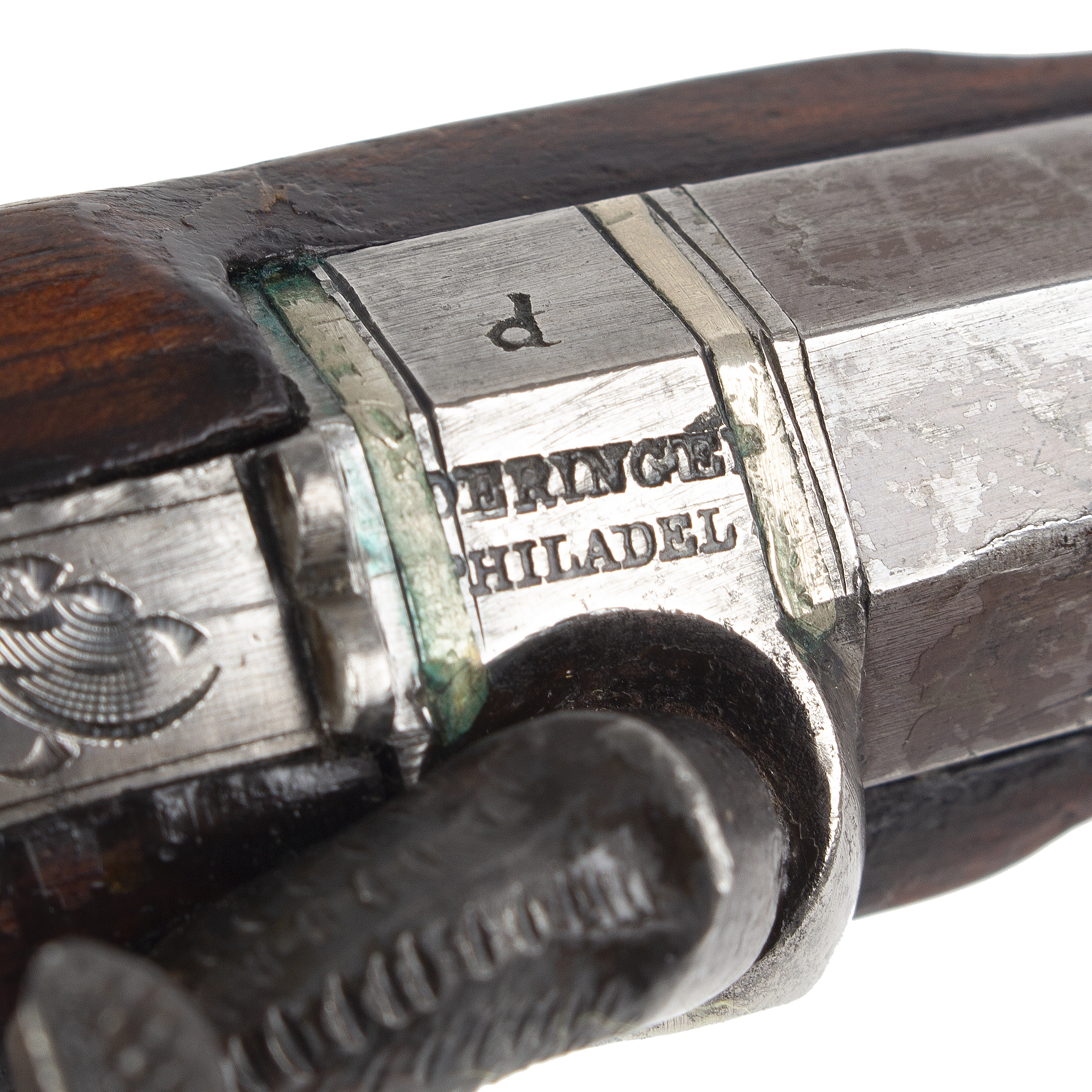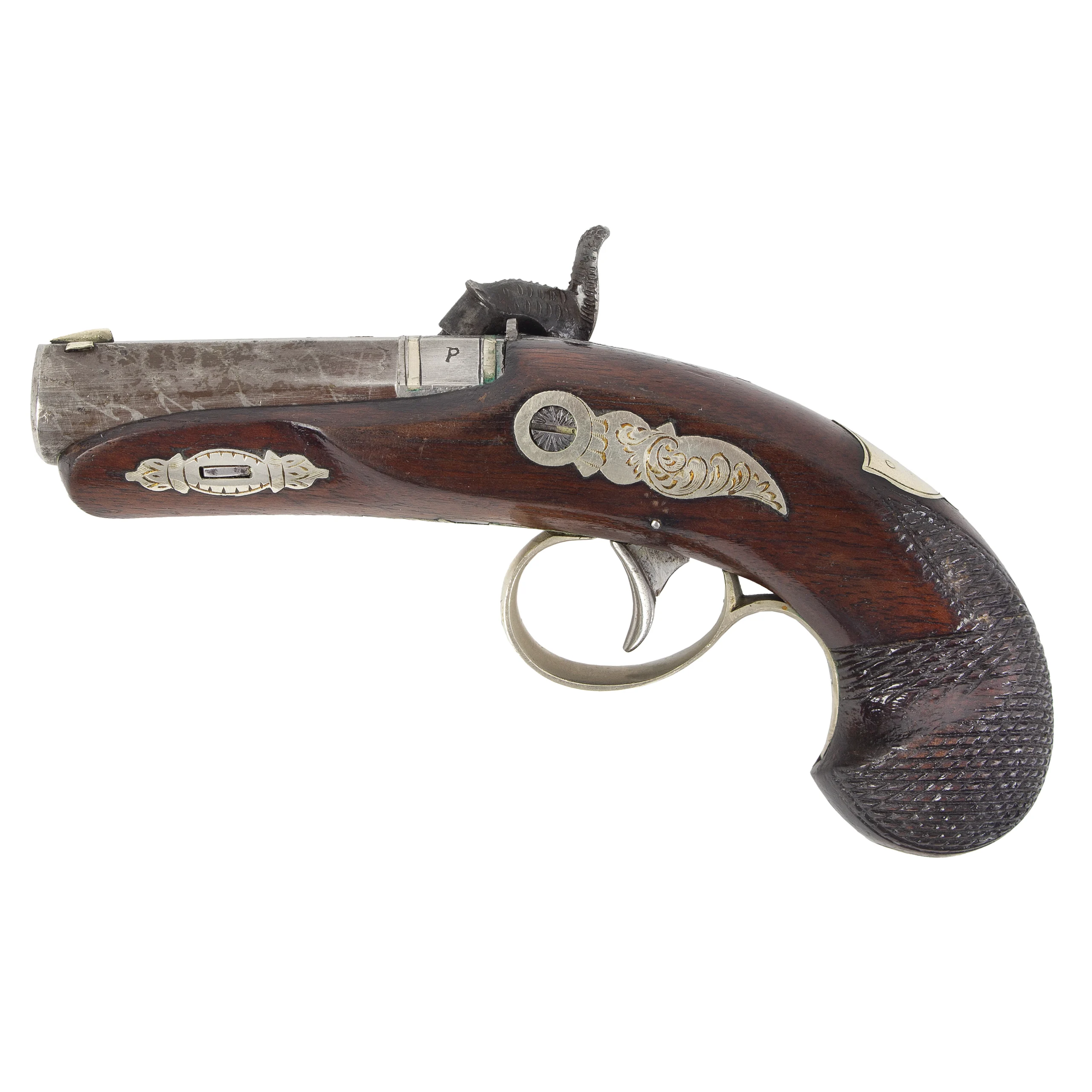 Lincoln Size Deringer with a silver blade front sight and notch rear sight. There is a standard “P” on the left side of the breech, “DERINGER / PHILADEL” on top barrel flat which is repeated on the lockplate with scroll engraving; scroll engraved tang, hammer and lock. Silver mounted including accent plate, barrel bands, escutcheons; buttplate and forend tip and trigger guard. The silver trigger guard is scroll engraved and features a pineapple finial and long tang. The grip is inlayed with a vacant silver shield shape thumbpiece featuring line-engraved border.