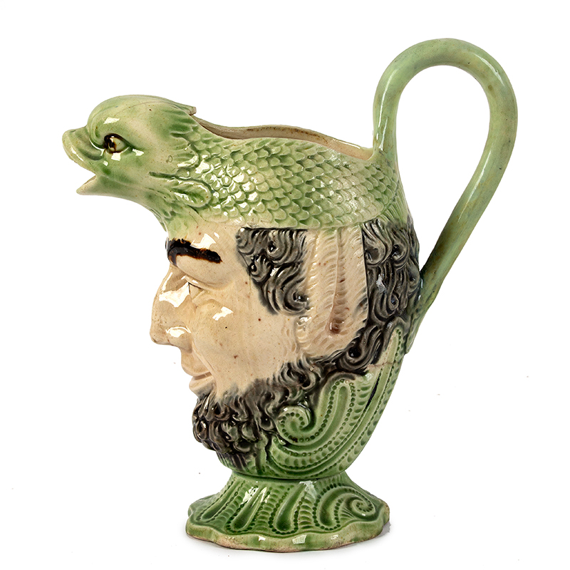 A dolphin and sailor pitcher. The green-glazed fish head, likely a dolphin, serves as the spout and handle, while the human face with a beard and expressive features represents a sailor. This type of piece, potentially from Ralph Wood’s Staffordshire workshop, often blended maritime themes with whimsical designs. The molded base and detailed glazing suggest it’s from the 18th or early 19th century.