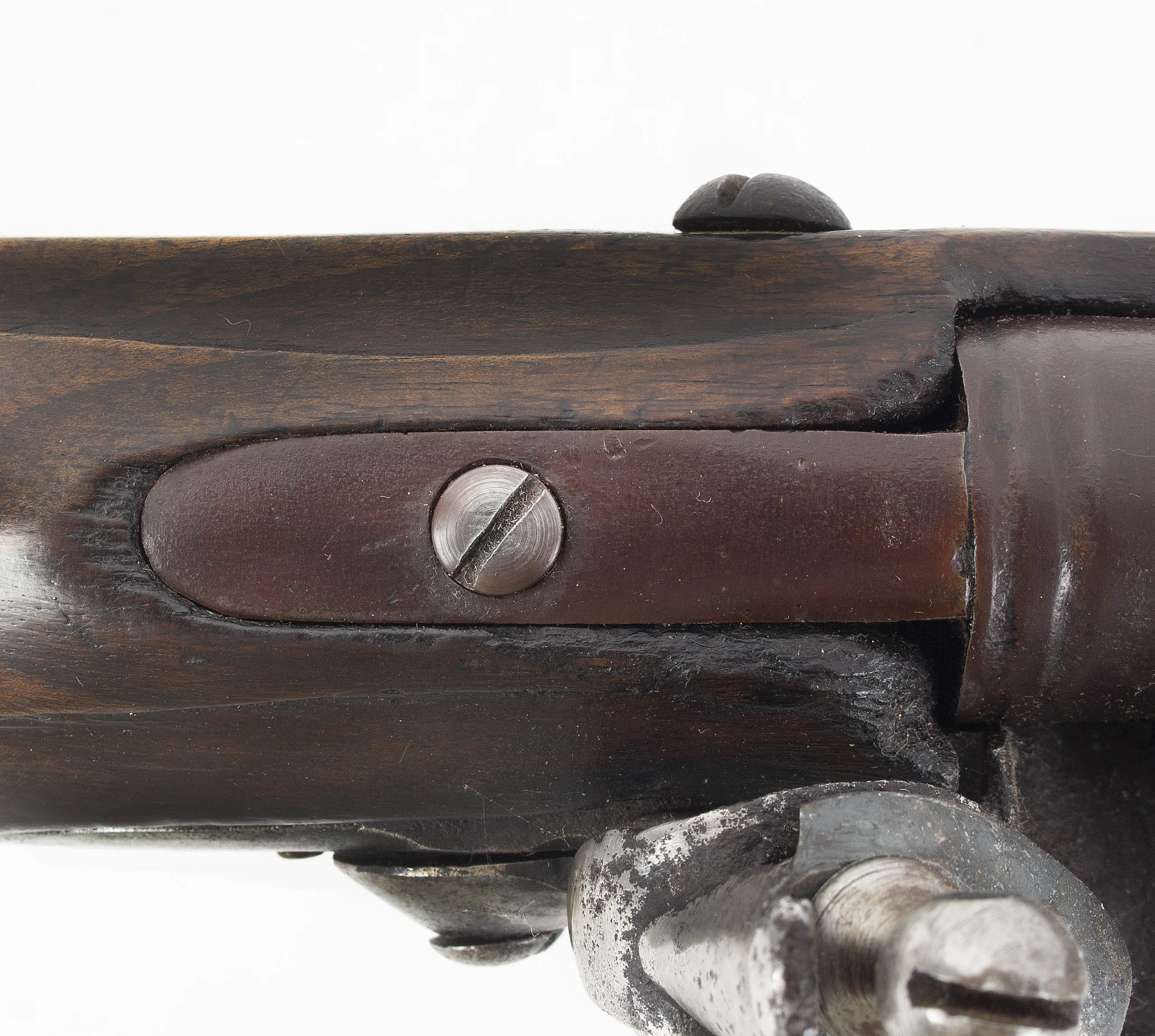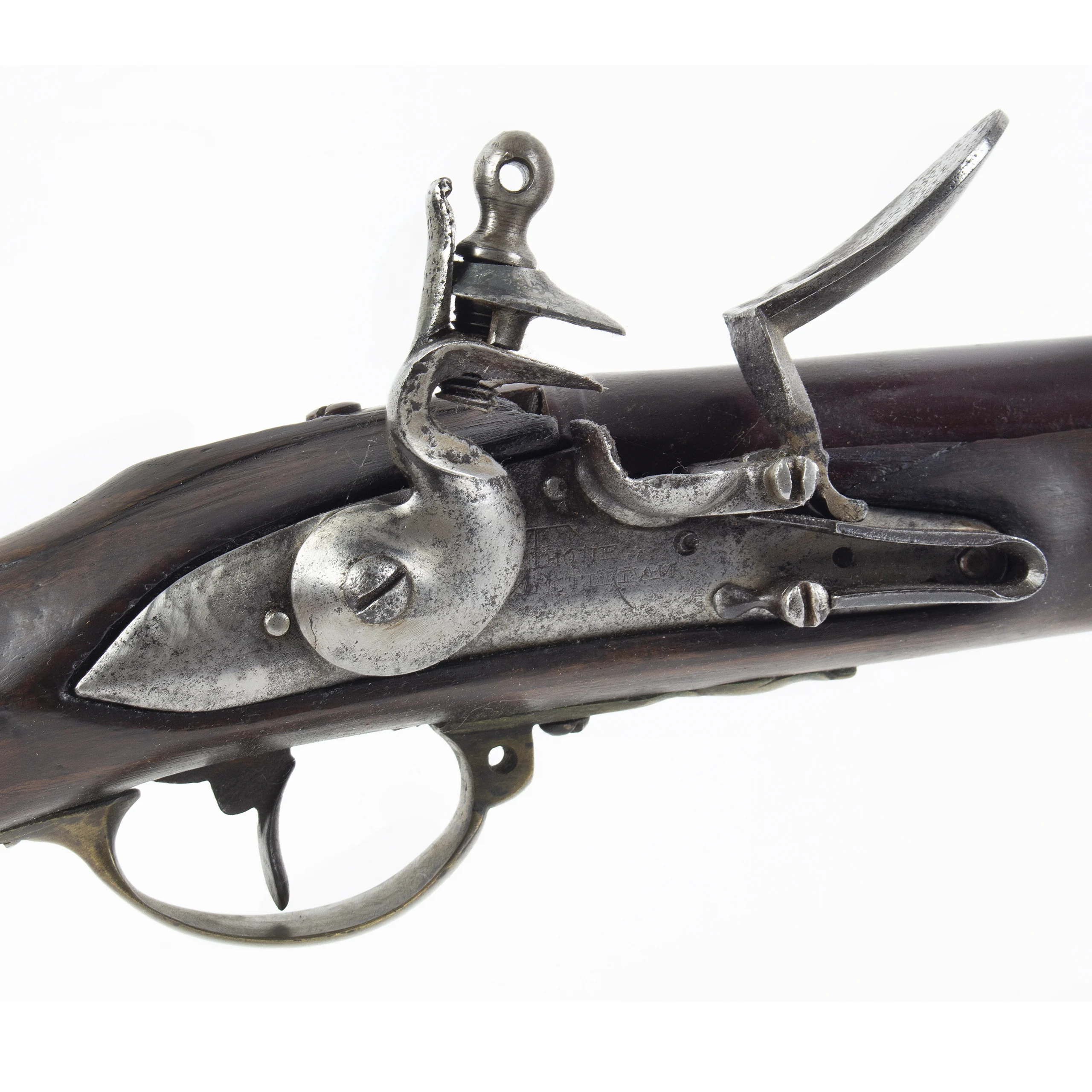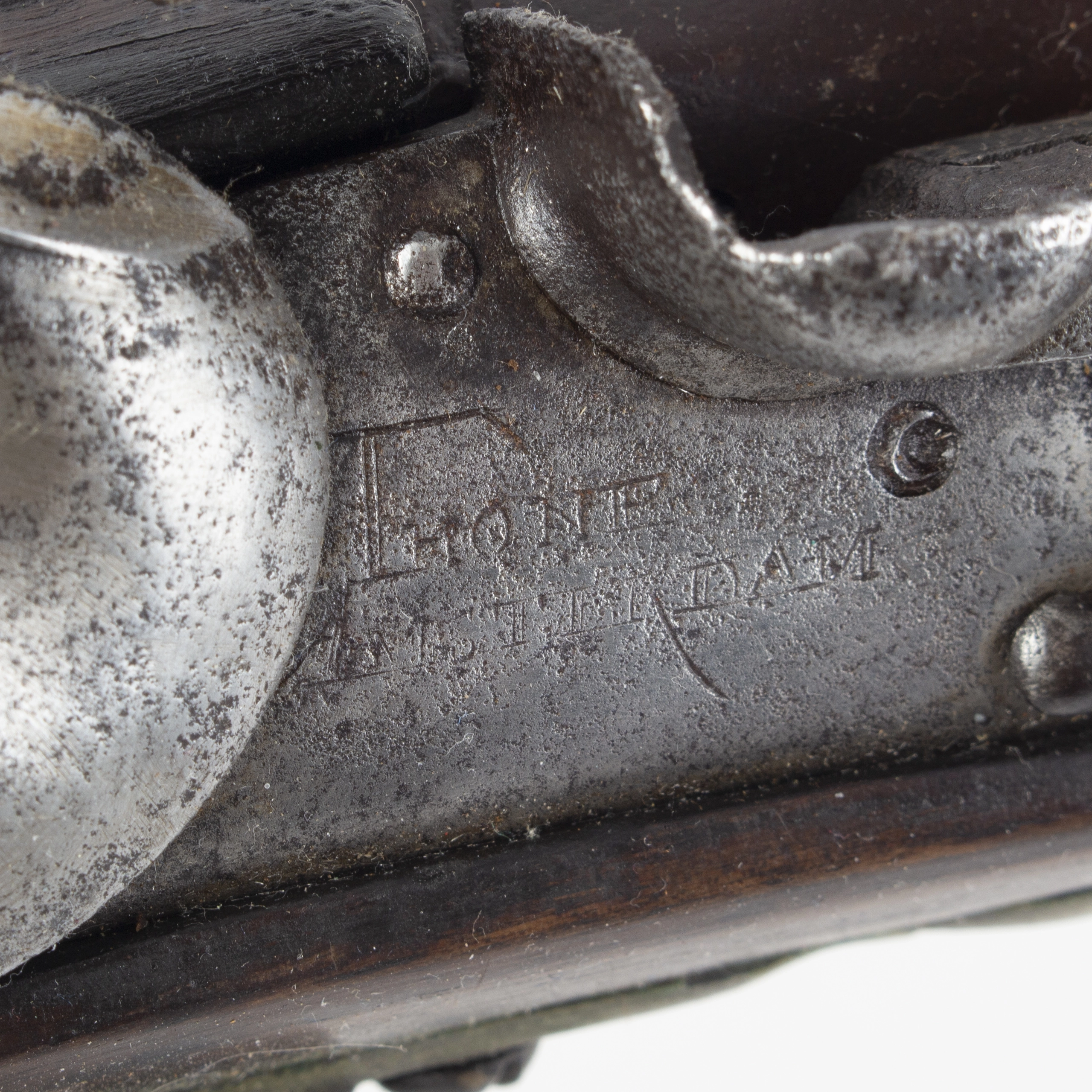 Original flintlock musket with bayonet lug and bayonet catch; barrel bands with spring retainers’ secure ramrod. The forward band incorporated foresight and sling loop. Full stock with plain carved apron centering barrel tang. Brass furniture including triggerguard that is pierced to facilitate sling, traditional Dutch buttplate, barrel bands [lower two are friction fit, the upper double strapped band spring retained], sideplate, and vacant thumbpiece. The convex lockplate appears to be in original flint and is engraved with maker’s name: THONE – AMSTERDAM.