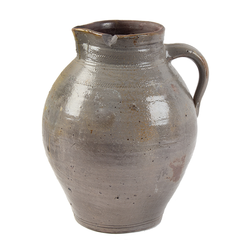 This unmarked large early nineteenth century salt-glazed stoneware pitcher shares characteristics with stoneware made in Middlesex County, New Jersey and the Hudson River region in New York. Impressive in both form and size, the pitcher is adorned with two rows of impressed coggle wheel decorations, which is a style used in Middlesex County and in stoneware production areas located around the Hudson River. Most notably coggle wheels of this type were used in Old Bridge, New Jersey and in the Albany, New York area among other locations, probably copying styles also produced in England and Germany in the eighteenth and nineteenth century.