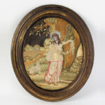Needlework picture housed in brass frame. Young lady standing in front of tree with houses in distance and a lamb at her side.