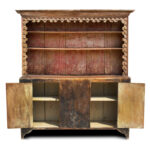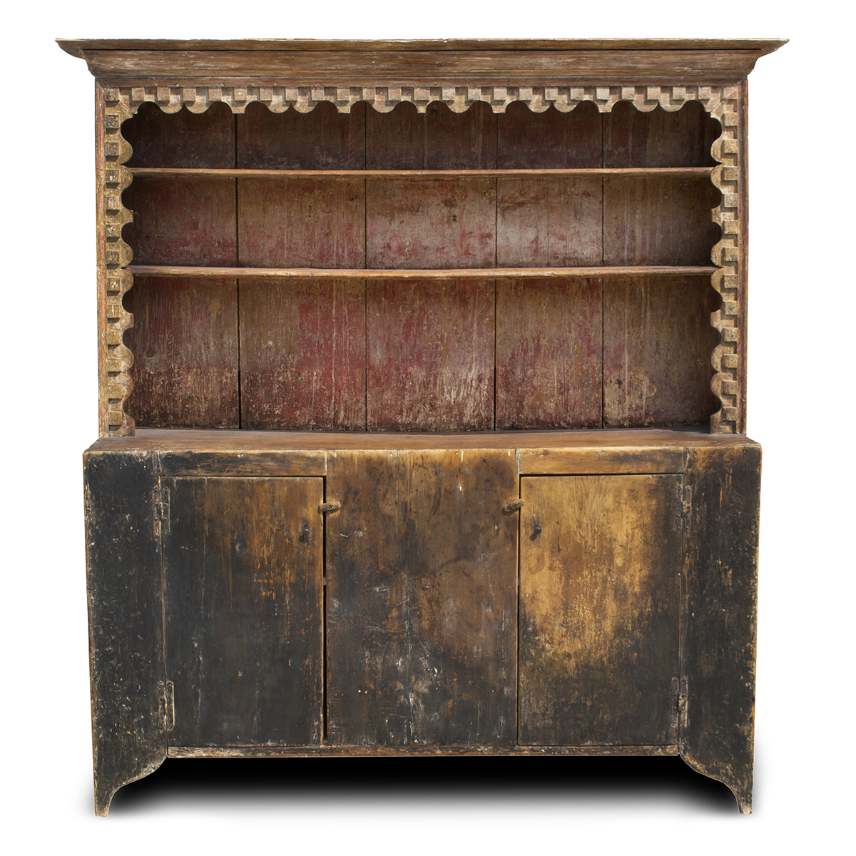 The open top featuring a bold crown molding has two shelves with molded front edges and a deck… all centered by beautifully scalloped molding ornamented with dental [blocks] molding. The lower case with a pair of plank doors retaining original foliated “H” hinges is raised on ogee cutout feet remaining at full height. The backboards are original as is the surface history. A soulful example.