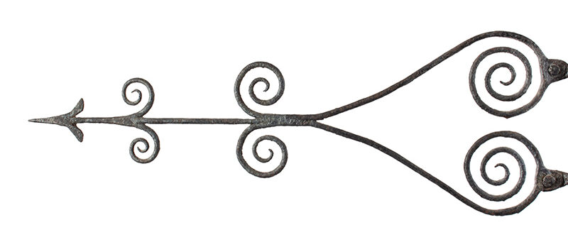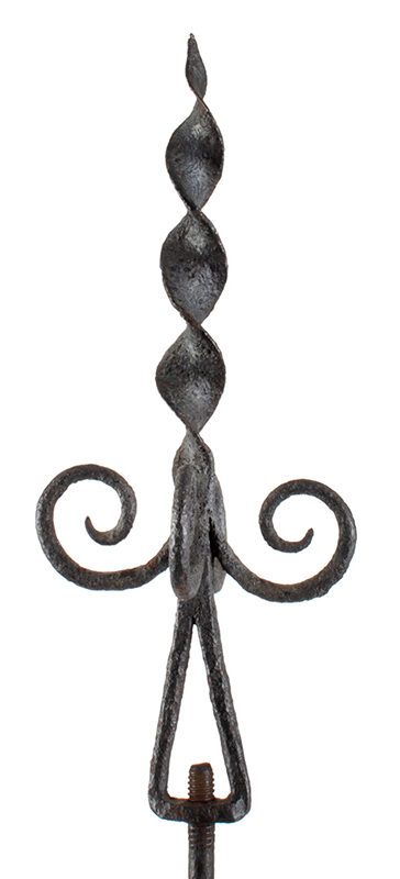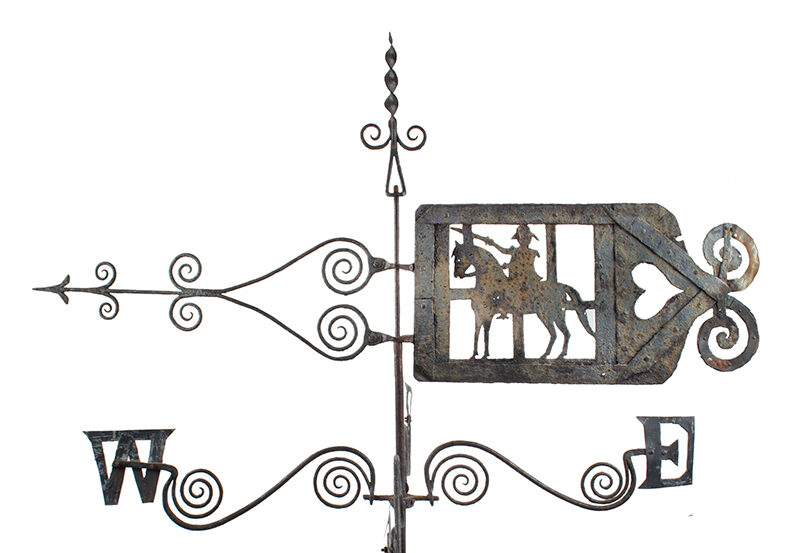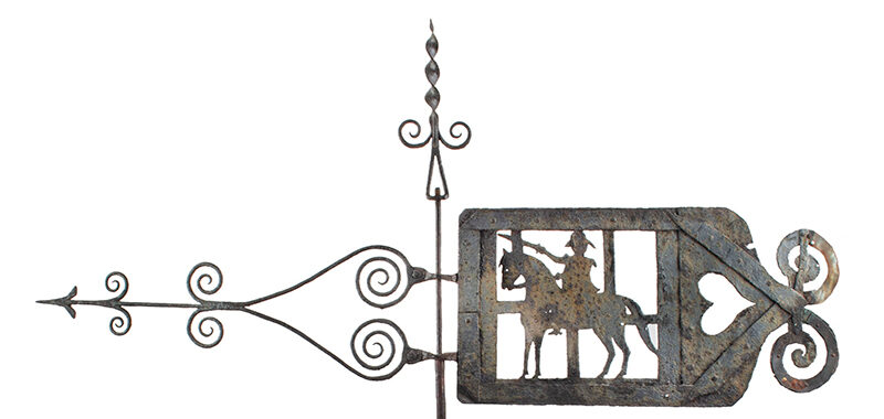 This outstanding weathervane…a rare and stirring survivor – is among the earliest known American weathervanes, it is certainly one of the oldest examples we have handled – the exceptional wrought iron composition displays a seasoned blacksmith’s masterful work…perhaps memorializing his own enrollment, or a veteran patron’s tenure as a Revolutionary War-era soldier.