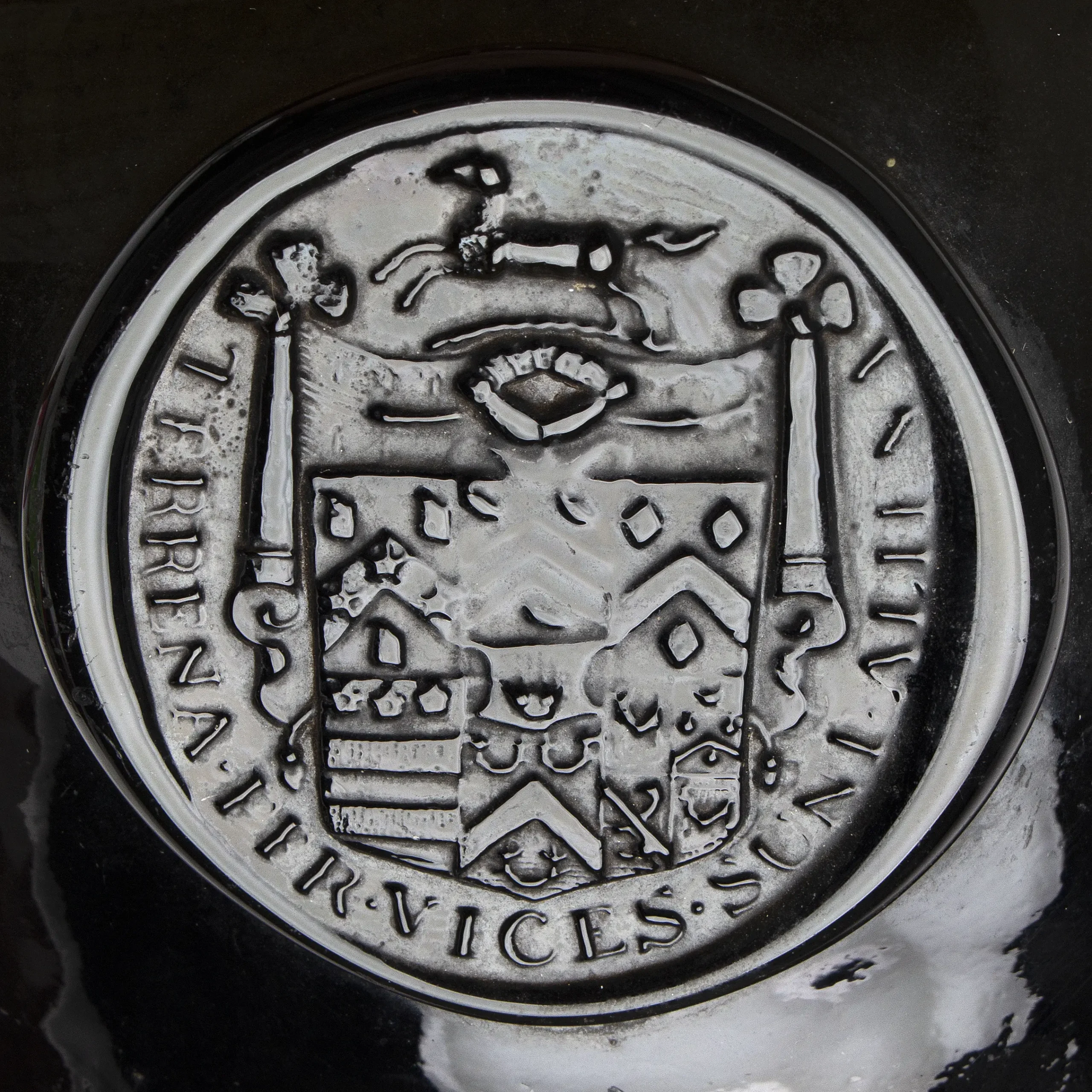 Just below the horse courant (running horse) at the top of the seal is probably an “eye of providence”, the symbol of Freemasonry. If this is the “eye”, it is very unusual and may be a key to determining the original owner. It is difficult to take the research farther. If it is not an eye, it could be a personal emblem added to the armorial.