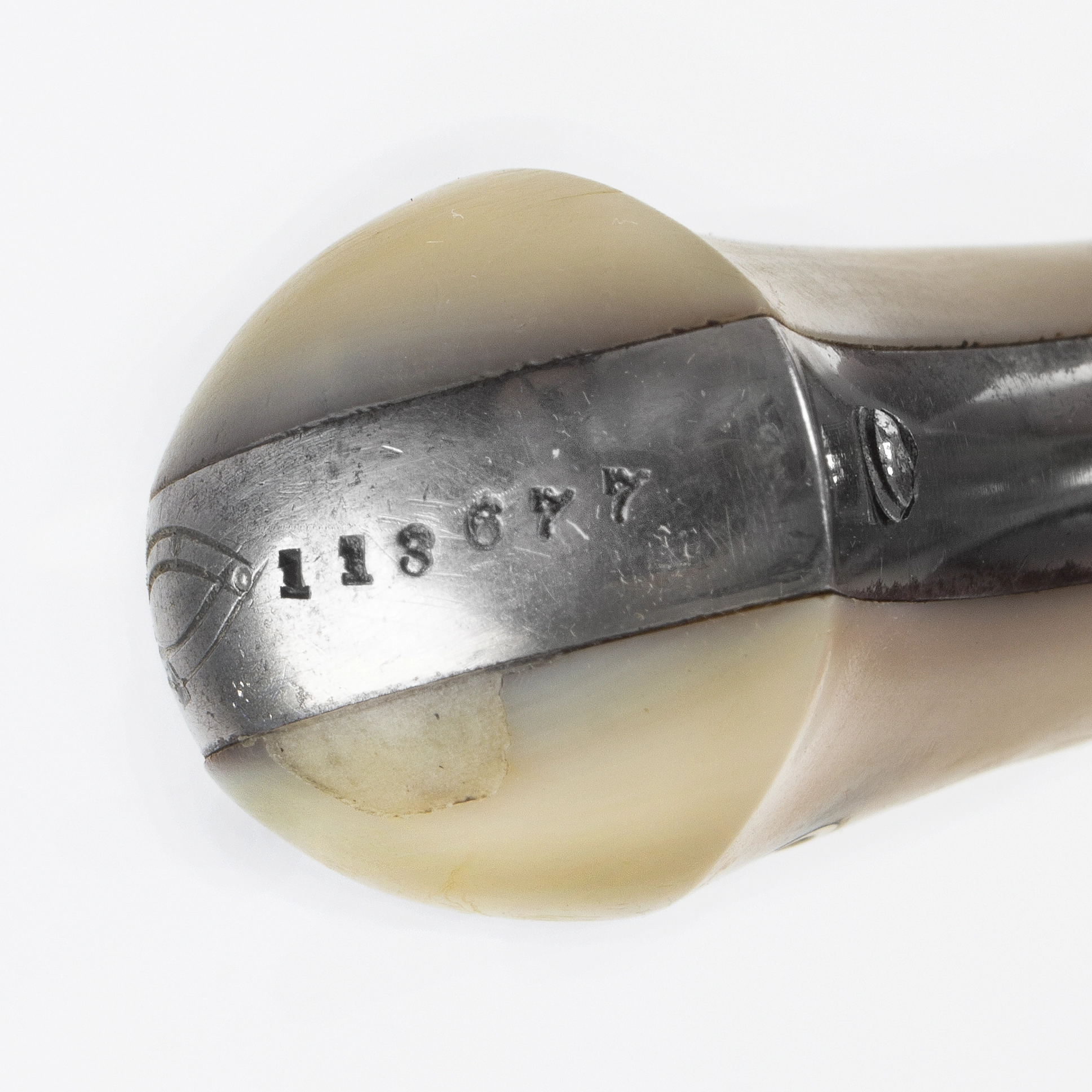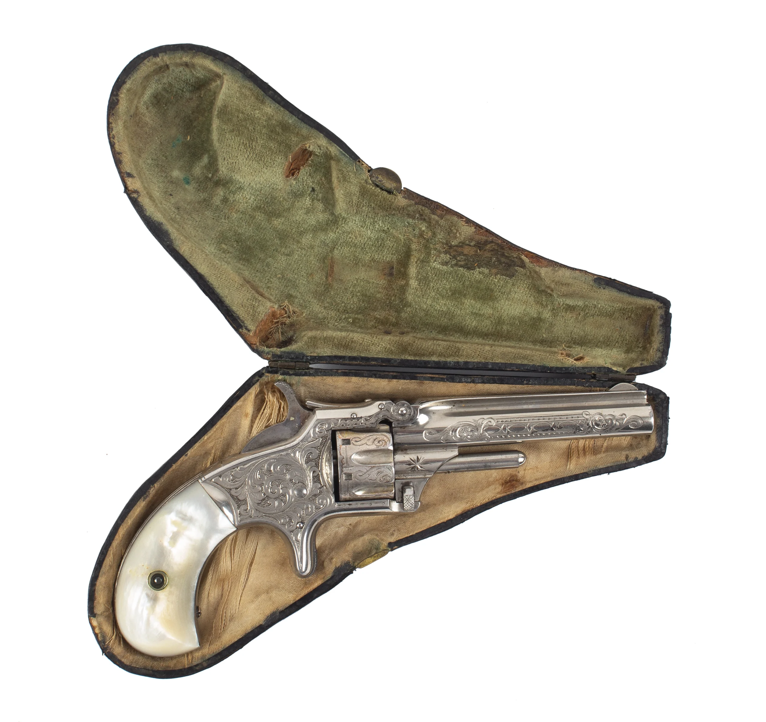 Material: Nickel finish, pearl grips, leather case with silk and brushed cotton lining