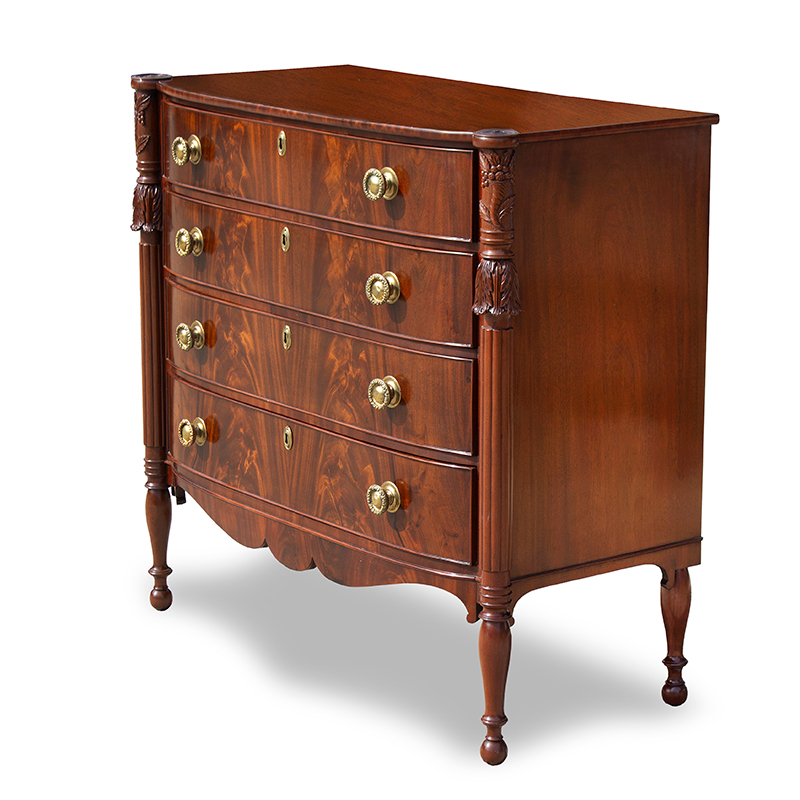 A fine American Federal carved chest of drawers in the Sheraton tasteā¦the carving attributed to Samuel Field McIntire; bowfront top with turreted corners, four slightly graduated drawers flanked by reeded columns featuring acanthus and cornucopia carving against a star-punched background; the columns continue to turned legs resting on ball feet. The front and side legs join shaped aprons with returns.