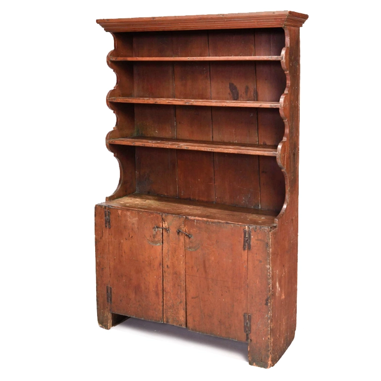 Item Condition: Old [period] surface with strong traces of red paint over early reddish brown, original iron hinges and hardware (left door catch has been moved up, but appears to be original), minor loss to bottom of feet; trivial wear throughout that is consistent with age and use.