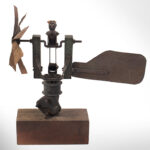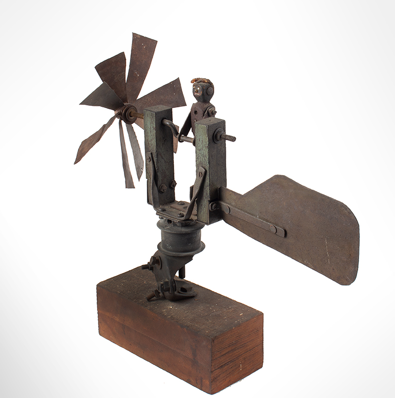 Wind turns propeller and crankshaft causing the man to seemingly work hard cranking shaft. Vertical framing blocks [wood] display original sage green paint; gentleman’s body painted red; head/face painted black… his remining hair looks to be rubber. The maker incorporated early auto parts and used beads and pinheads for coat buttons, eyes, and nose… mouth is carved.