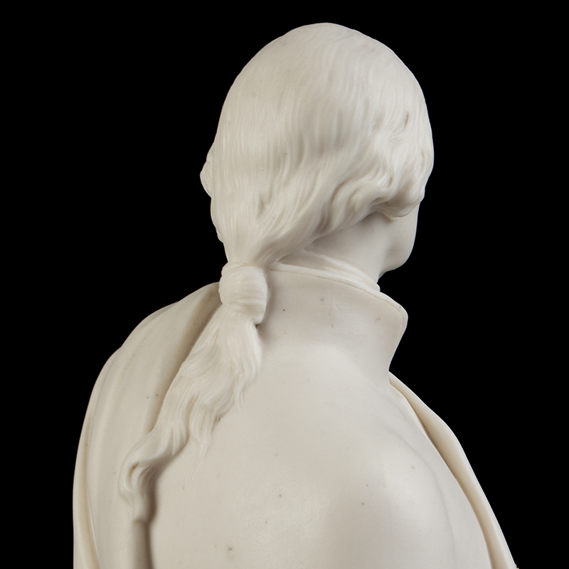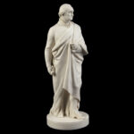 A fine solid parianware statue of “Washington” in stride, holding a rolled paper in his right hand, left arm bent clutching his toga to his chest. Under his toga, he wears his colonial attire, buckled shoes and stockings, and standing on circular base impressed “WASHINGTON”.