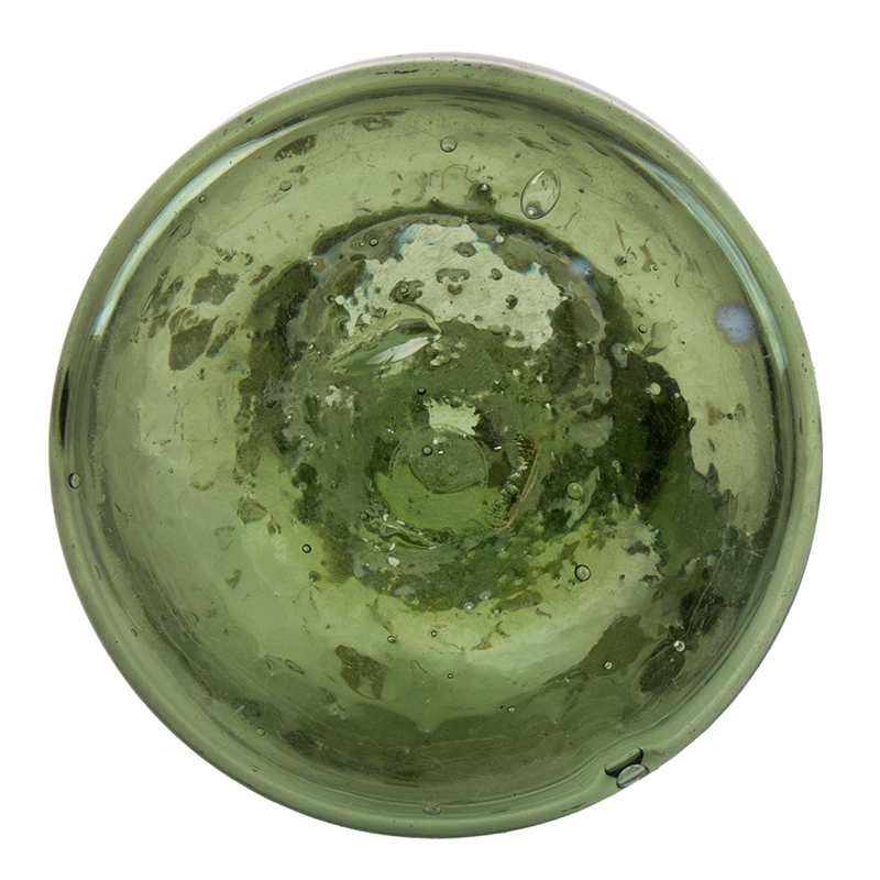 A very appealing free blown small Nailsea flagon in light olive green splashed with large white speckled flecks. Large, applied rolled handle with crimped tail terminus. Deep club form with rounded sloping shoulders; tapering pinched neck continuing to the outwardly flaring lip. Flat base with pontil. Full original surface sheen. Lovely striated white enamel tears to neck.