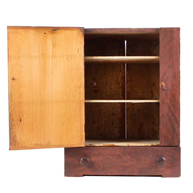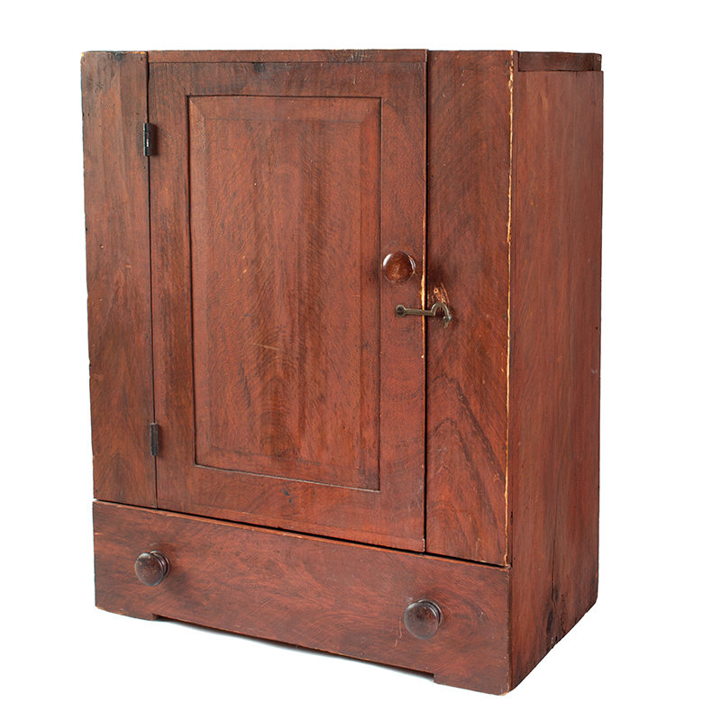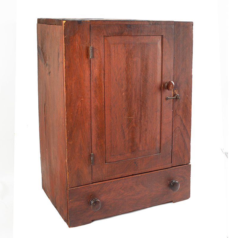 Single raised panel door opens to a fitted interior having three shelves. The door and drawer retain original wood pulls. Features original faux graining – painted in red and black.