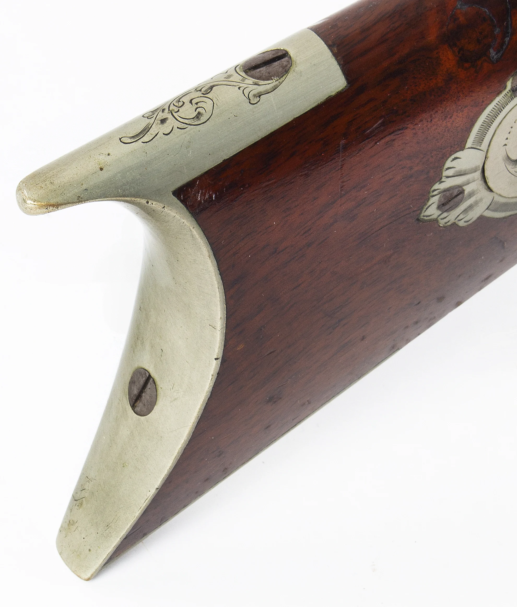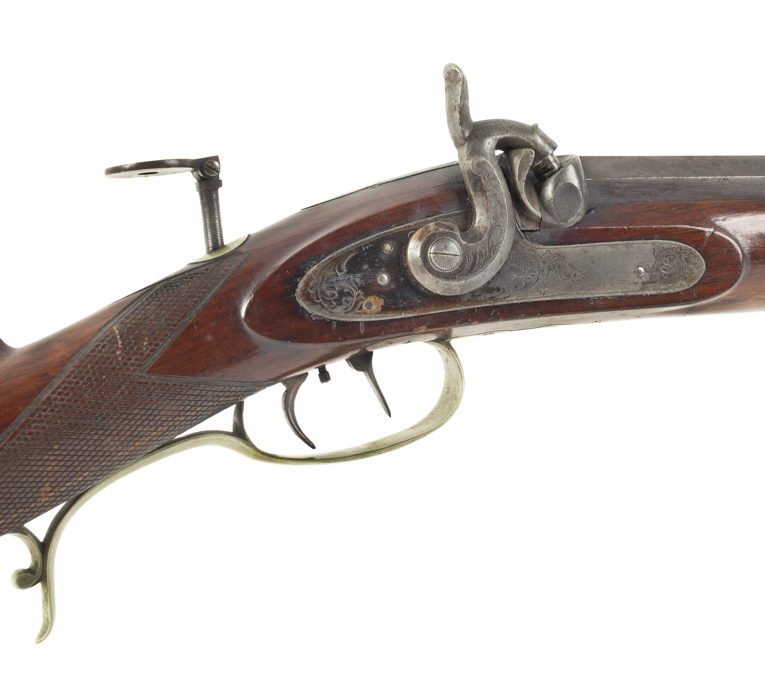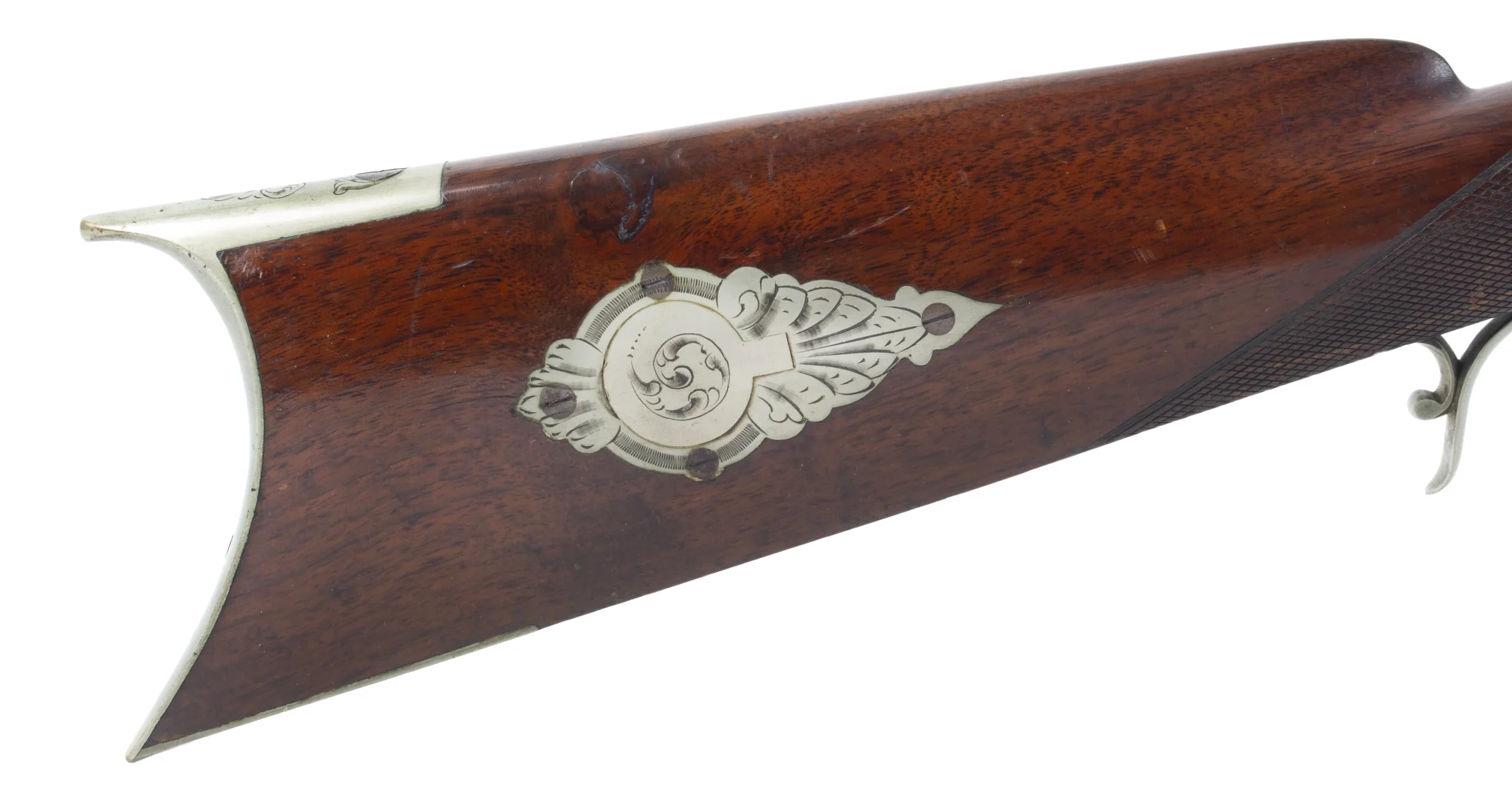 [inlaid with two silver bands] and tang; the trigger guard with pineapple forend and long tang is inlaid as is the “shooters” crescent shape buttplate toe. The German silver cap box is beautifully engraved as is the stag inlaid on cheekpiece and lockplate screw head and escutcheon, The rear entry pipe is lightly engraved; German silver forend cap is plain. The engraved lockplate and hammer retain 50% blue. There are two steel ramrod pipes. The .42-caliber rifled octagonal barrel retains approximately 85+% brown; rifling is sharp and clean. Sight combo is a Lyman-influenced target upgrade set (front: hooded globe; rear: adjustable tang peep with threaded elevation post; naturally aged patinated surface.