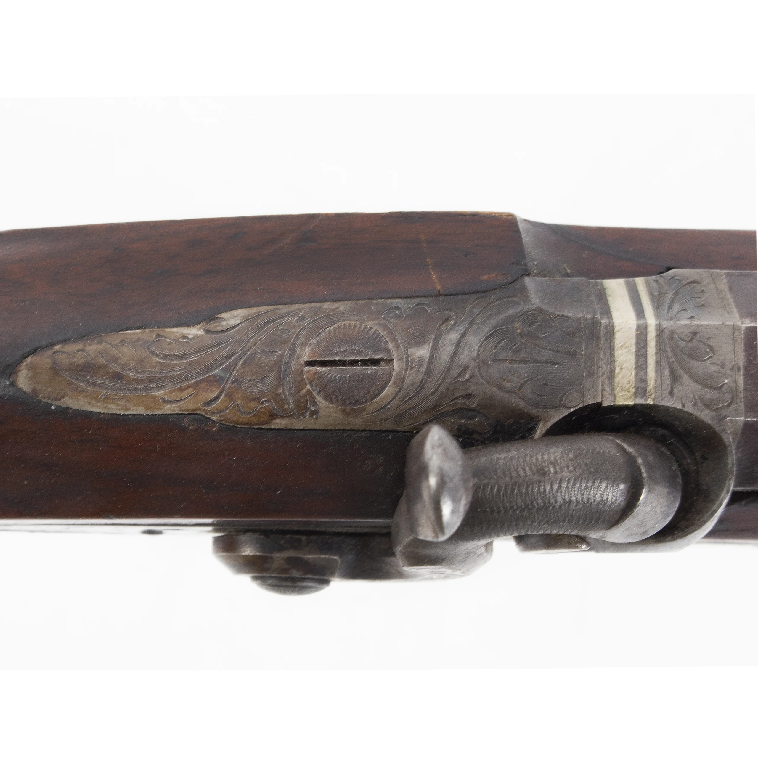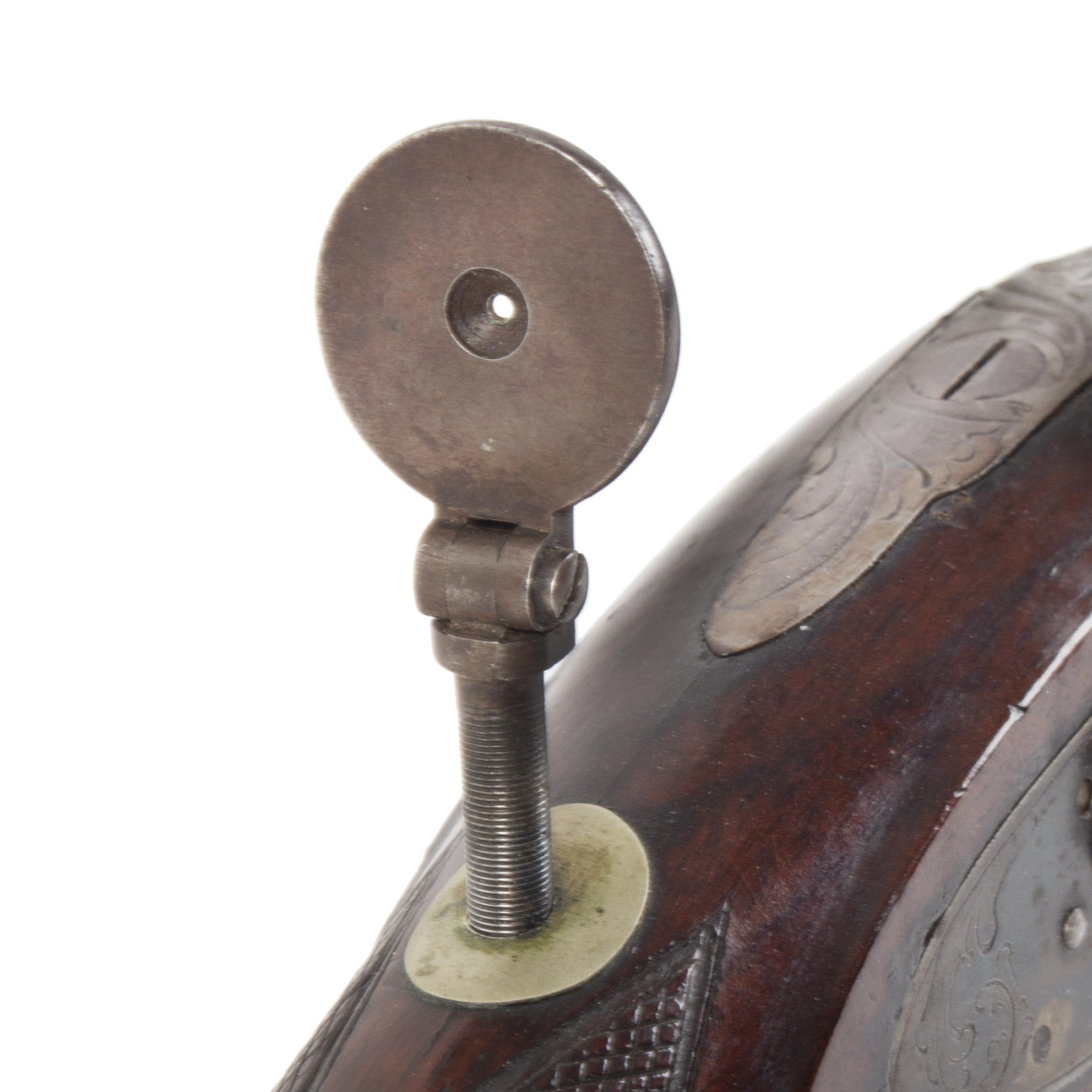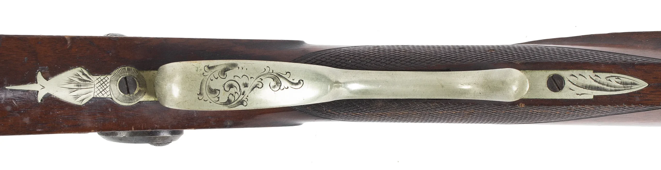 [inlaid with two silver bands] and tang; the trigger guard with pineapple forend and long tang is inlaid as is the “shooters” crescent shape buttplate toe. The German silver cap box is beautifully engraved as is the stag inlaid on cheekpiece and lockplate screw head and escutcheon, The rear entry pipe is lightly engraved; German silver forend cap is plain. The engraved lockplate and hammer retain 50% blue. There are two steel ramrod pipes. The .42-caliber rifled octagonal barrel retains approximately 85+% brown; rifling is sharp and clean. Sight combo is a Lyman-influenced target upgrade set (front: hooded globe; rear: adjustable tang peep with threaded elevation post; naturally aged patinated surface.