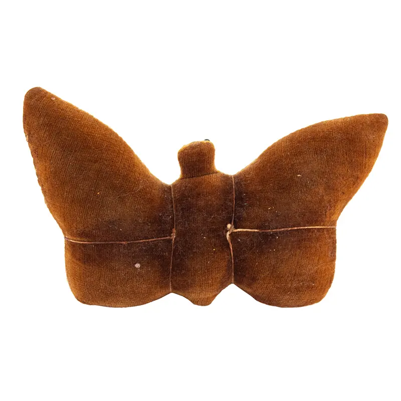 A whimsical and folky sewing notion facilitating pin storage. Long thread stitched embroidered wing and body details.