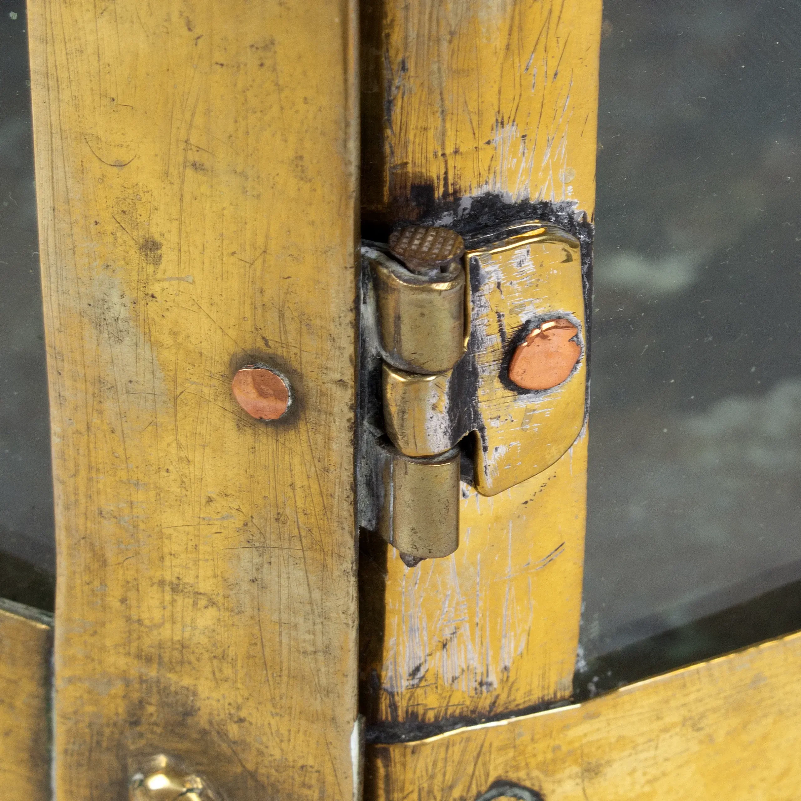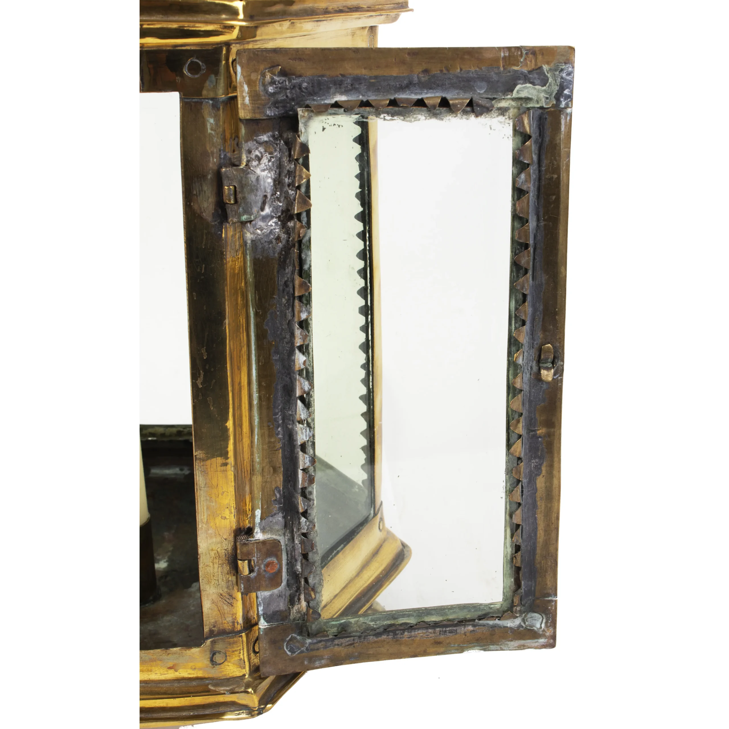 This is an exceptional lantern of great form and design with pierced domed lid ornamented with planished bosses above a hexagonal frame with windows, a single nozzle centrally located, and on a molded base raised on 3 ball feet.